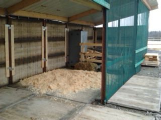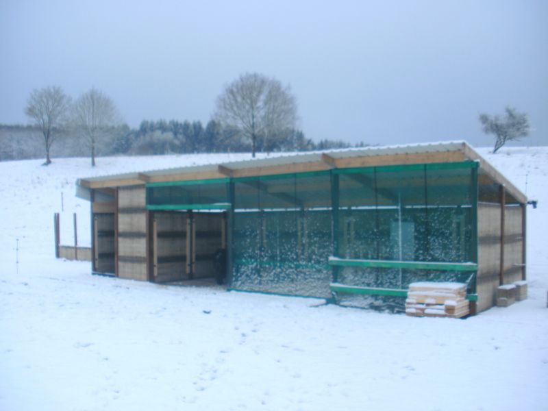| Dire merci | ![]() Il y a encore un boxe à côté. Filet brise-vent super efficace. 3m de réserve à foin et ramoire sellerie. 3m d'abri pour deux shetlands. 3m de zone de pansage. Non visible sur la photo, 3m de boxe fermé. Panneaux de douglas de chez Leontine Van Leeuwen + planches pour renforcer. Pas de dalle. |