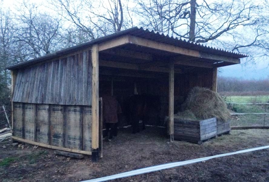 | Dire merci | nous, 4 poteaux en fer enfoncés de 1m50 dans le sol. Des poteaux identiques pour relier les 4 pieds et pour fixer le toit. Des tôles feraille pour le toit et 2 côtés. Pour le troisième côté, une caisse de camion pour stocker paille foin grains selle Licol et tout... L abri fait 5x5 pour 3 filles de 1.40, et 3m de haut devant et 2.5m au fond. Budget, 50e pour les planches en bois au sol pour que le fumier n appuie pas directement sur les tôles. Le reste c'est de la récupération : poteaux achetés sur une vente aux enchères en énorme lot (par 150) donc prix bas, les tôles c'est ce qu'il reste des différents bâtiments montés par mon beau père (tôles en trop, donc toutes différentes), caisse récupéré sur un camion accidenté qui partait à la casse.. |
