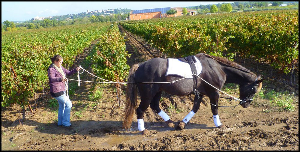 DéconnectéDire merci | les longues rênes permettent de travailler le cheval de la même façon que monter, à une différence près, il n'a pas le poids du cavalier sur le dos. d'autre part, ça évite de tomber ! ça responsabilise le cheval et ça travaille la confiance mutuelle entre le cheval et le cavalier. tant que tu n'as pas essayé toi même, il est difficile de comprendre ce que ça fait. les longues rênes doivent être l'étape obligatoire de débourrage du cheval avant de monter sur son dos. il acquiert un certain savoir qu'il pourra tenter de reproduire malgré le poids du cavalier qui le gêne. Le cheval se fatigue moins quand il n'a rien à porter. voilà, j'espère que ça t'as servi. Perso, j'aime bien les LR en extérieur, sauf quand le cheval fait demi tour et se retrouve face à toi, là, c'est pas pratique. sinon, très pratique pour gérer ses peurs, très pratique pour ne pas lui tirer sur la bouche. mais... c'est un peu sportif pour moi car il marche vite en extérieur ! ça le motive la balade. Je n'ai pas encore commencer le travail de chasser les hanches,... aux LR. Je me suis plantée, j'ai commencé en le montant, tout faux! Par contre, je mets les rênes dans l'anneau le plus haut du surfaix. moins encadrant mais comme ça remplace nos mains à cheval, nous n'avons pas les mains à la hauteur des flancs donc à hauteur des flancs, pour moi, ça va pour un travail précis, pour le démarrage pour être vraiment encadrant mais pas trop après. mais ça, ce n'est que mon point de vue, vos avis sont peut être différents... |