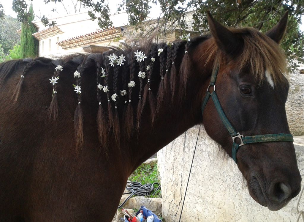 DéconnectéDire merci | mode d'emploi : tresser un cheval pour éviter la chaleur suer pdt 2H par monts et par vaux au retour, je vois des violettes, des renoncules et je me souviens du défi ! Tiens, je les cueille ! Arrivée à la maison, j'installe les fleurs à moitié fanées dans la crinière |