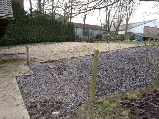 | Dire merci | Donc comme vous voyez, du sable sur une aprtie et des cailloux sur une autre. La partie cailloux est en fait le passage entre les deux paddocks d'herbe (un qu'on voit et l'autre pas).![]() Ici on voit comment la partie cailloux s'altère. La grosse difficulté de ce truc c'est que : - c'est en pente, donc les chevaux avancent vers le bas de la pente en mettant leur poids qui fait une pression en diagonale. - le terrassement a été fait dans la boue et donc mal fait. - il n'y a pas assez de couche de cailloux, sans géotextile ça s'enfoncerait comme c'est le cas sur une partie ou j'ai mis des cailloux sans géotextile. J'ai fait ça au lieu d'arrivée des paddocks car c'est tellement boueux (y avait presque 70 cm de vase gluante à cet endroit) que le géotextile se serait déplacé, aurait percé à coup sur, et donc j'ai mis : une dalle de béton, une ancienne dalle de cloture que j'ai remise au sol à l 'aide de mon parrain et une bonne brouette, et puis les cailloux autour, je devrais en remettre encore plus pour bien stabiliser cette partie qui est quasi marécageuse mais pour le moment,... ça se tient ! C'est un peu mouillé mais les cailloux font leur effet et on sent, que même s'il y a de la boue et que c'est bien liquide, que dans le fond, on s'enfonce beaucoup moins. voilà, après ça peut être intéressant de mettre des système de dalle spécialisées.... mais pour la même surface je doute que ça revienne moins cher, donc c'est au choix. J'ai voulu des cailloux aussi pour que ça fasse leurs pieds....et aussi le fait que ça soit en pente chez moi et pas une pente bête et régulière, je craignais que le raccord des dalles ne soit pas bien terrible et que ça casque. En même temps j'ai pas étudié le truc à fond. ![]() |