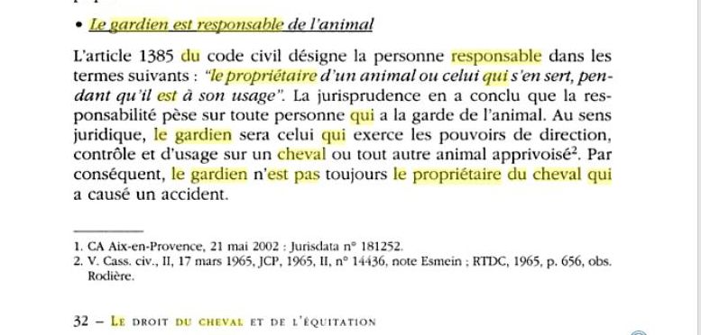 | Dire merci | Exactement, car je suis bel et bien responsable en cas de probléme ou si les personne qui ont la jument ne veulent pas payé frais véto ou autres, ou bien si Ivette créé un accident c'est le gardien qui est responsable de ton ex jument ! les papiers n'ont rien à voir là dedans ! ils ne sont même pas une preuve de propriété ... et franchement, même si Borane le dit un peu brutalement, on aurait pu s'attendre en effet à ce que la réaction se fasse sur le fait que la jument retravaille et ne soit pas au pré comme prévu plutôt que sur cette histoire de responsabilité qui n'en est pas une ![]() |
