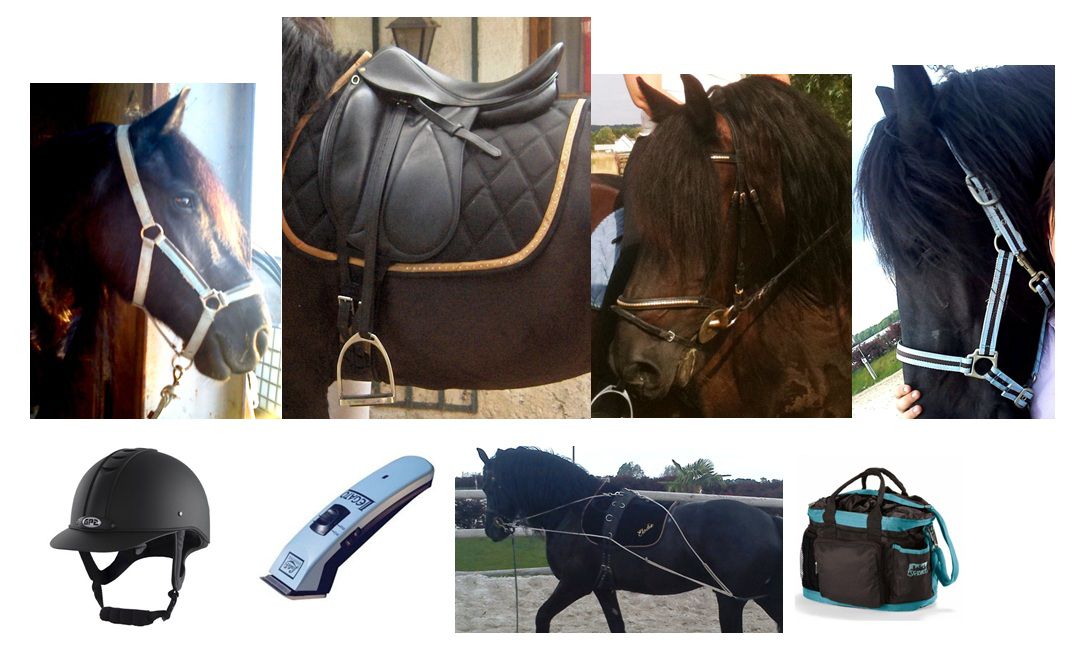 DéconnectéDire merci | Voilà mon matos + description au cas ou... 1 selle DEVOUCOUX modèle Makila, taille 18.5 pouces, quartiers 4A 2 licols bleus et marrons + longes, taille Cheval 1 filet noir et doré, 1 bride noir et blanc, taille Cheval 1 bombe GPA modèle Titium taille 60 1 tondeuse bleu clair LISTER modèle Legato dans mallette 1 sac de pansage bleu et marron (contenant brosses, cure pieds, huiles, pinceaux, negerol…) 1 enrenement PESSOA + surfaix noir en tissu avec bouclerie un peu rouillée 1 paire de gants ROECKL, noirs Matériel de maréchalerie |