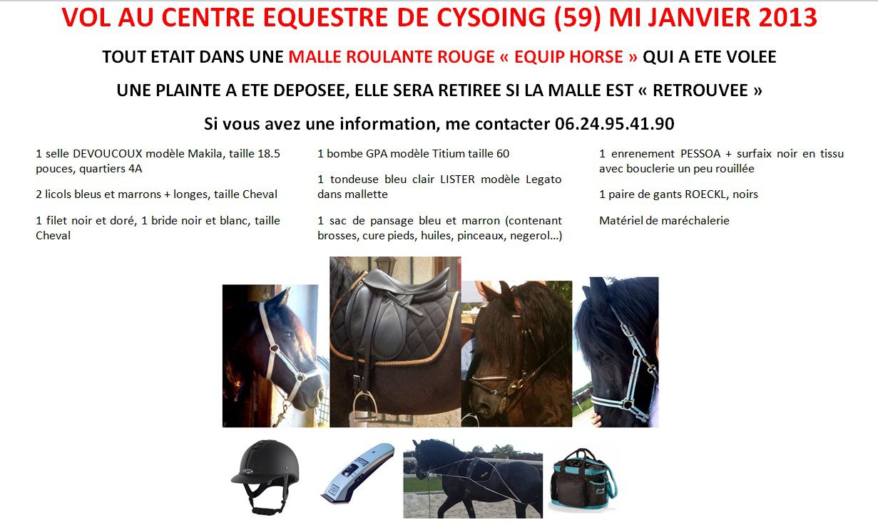 | Dire merci | Il y a souvent des vols de selles (genre vidage de la sellerie) dans le Pévèle (Flyer a fait plusieurs écuries). ça se sait que le coin est riche. Et Cysoing a toujours été ouvert à tous vents Il y a quelques années les jeunes du coin venaient à l'écurie tagger les chevaux et ouvrir toutes les portes de boxes Bon courage en tous cas. chevalannonce fonctionne bien (pour la revente de ta selle). |