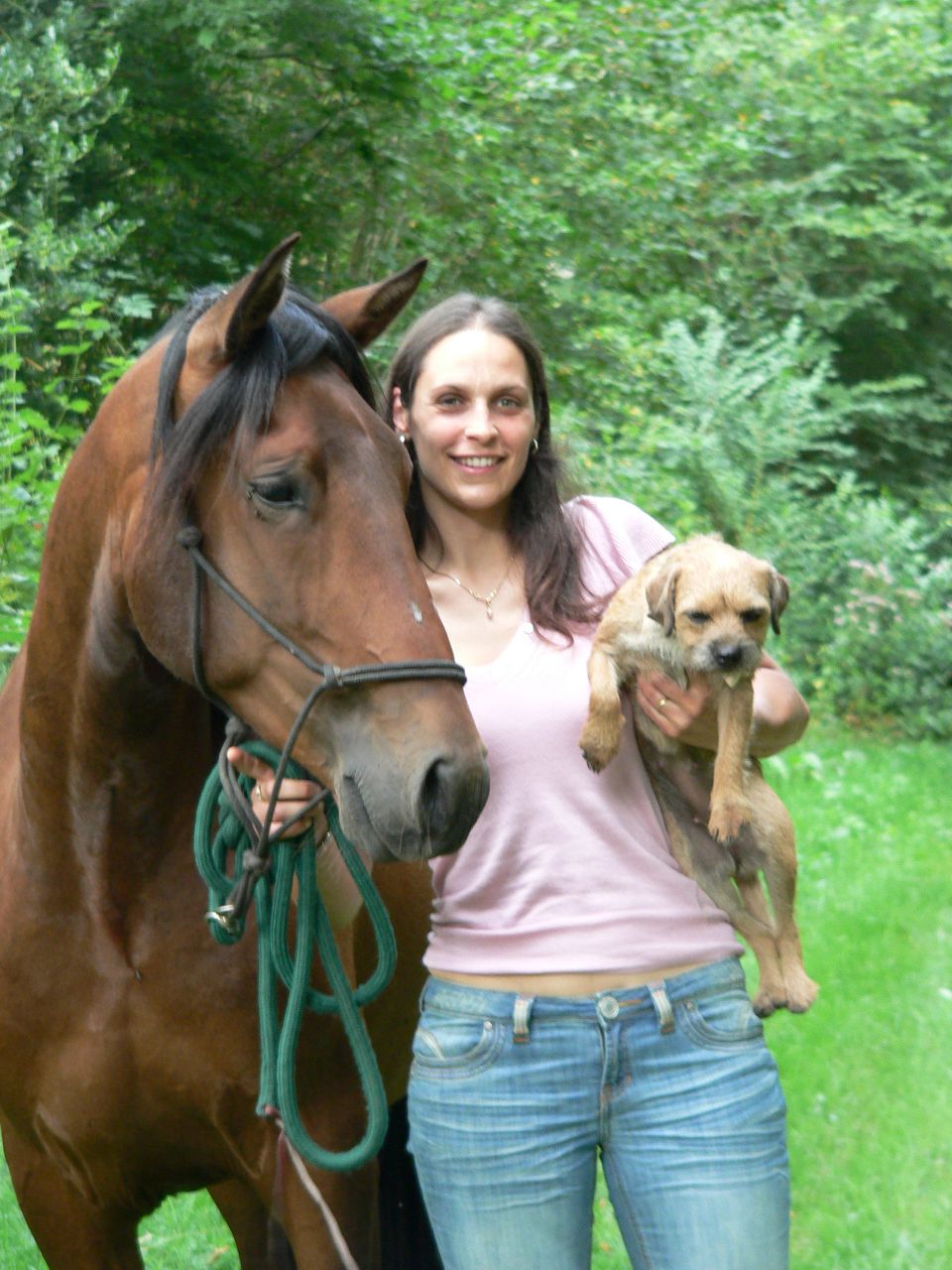 | Dire merci | j'ai un trio de petit Border Terrier avec qui je partage ma passion équestre , on fait de temps en temps des balades à la plage aussi . ils sont méfiant vis à vis des chevaux , aucun soucis de ce côté là mais ils ADORENT venir avec moi aux écuries ! là avec Dolce ma 1ere femelle ![]() là avec mon étalon Border Terrier Festival : ![]() ![]() |