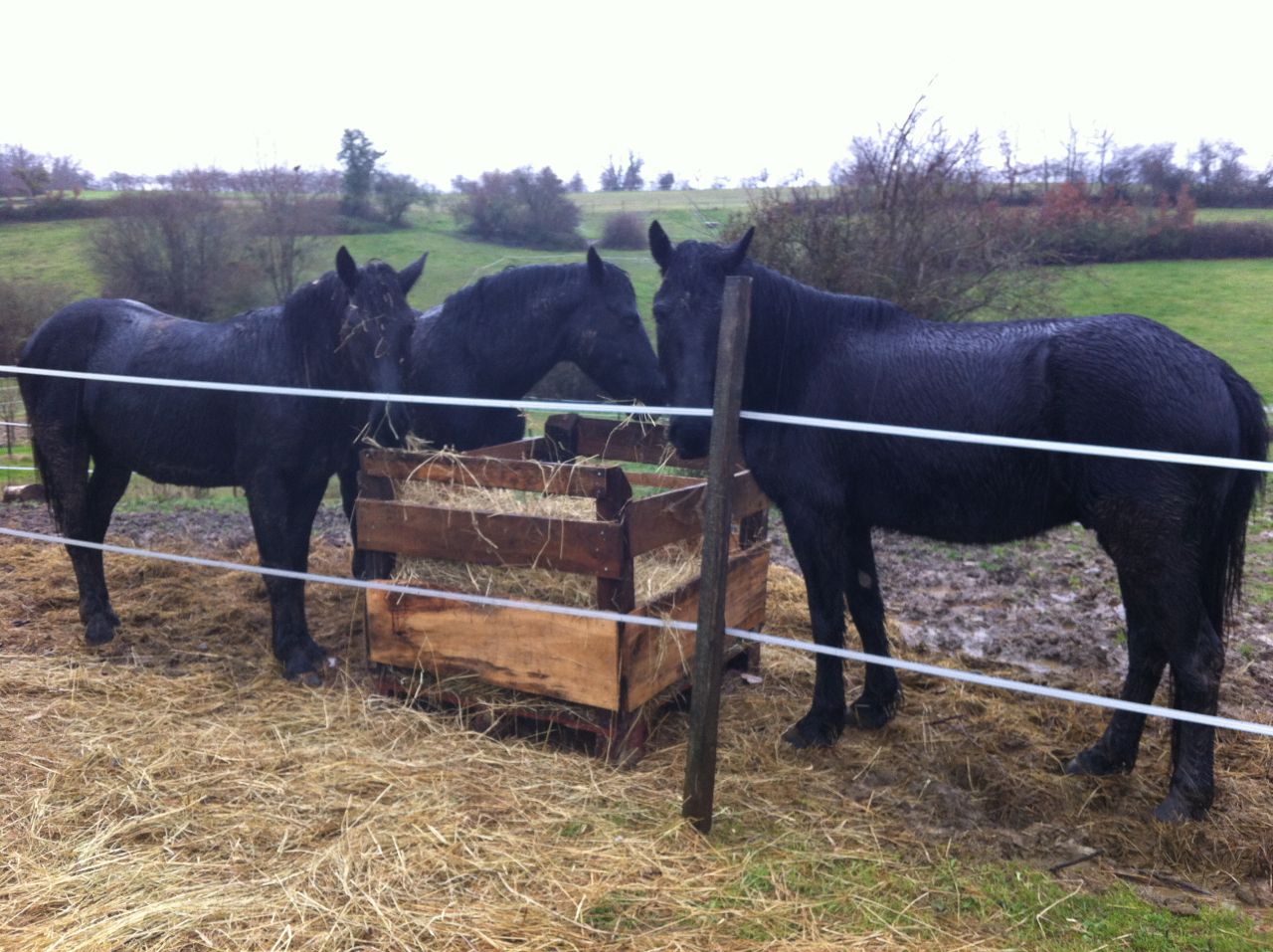 | Dire merci | Les palettes c'est pas très solide, vaut mieux de la grosse planche solide que l'on visse (pas de clous). "Du coup de l'acier en hauteur, tout le monde est punie (enfin je suis pas fan pour d'autre raison)" On avait des râteliers métalliques avant en hauteur. On a tout bazardé pour les inconvénients suivants : - faut soulever le foin pour mettre dedans quand il y a du vent, tu es heureux... et puis c'est lourd. - les chevaux mangent la tête en l'air - les chevaux développent plus d'emphysème et toussent plus de façon générale. |