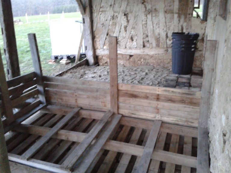 | Dire merci | Quand tu parles d'une boule de foin tu veux dire un roundballer je pense ? Donc dans les 250kg-300kg ? Pour comparaison pour nos 2 chevaux 1 round fait 10 à 15 jours (on a parfois des rounds de 350kg) alors oui je pense que ça devrait tenir les 5 jours ! Question bricolage je ne suis pas une pro mais tu n'es peut être pas obligée de déclouer chaque planche de chaque palette ? Et faire une mangeoire de ce genre : ![]() En fait juste scier les palettes aux dimensions voulues puis assembler. |