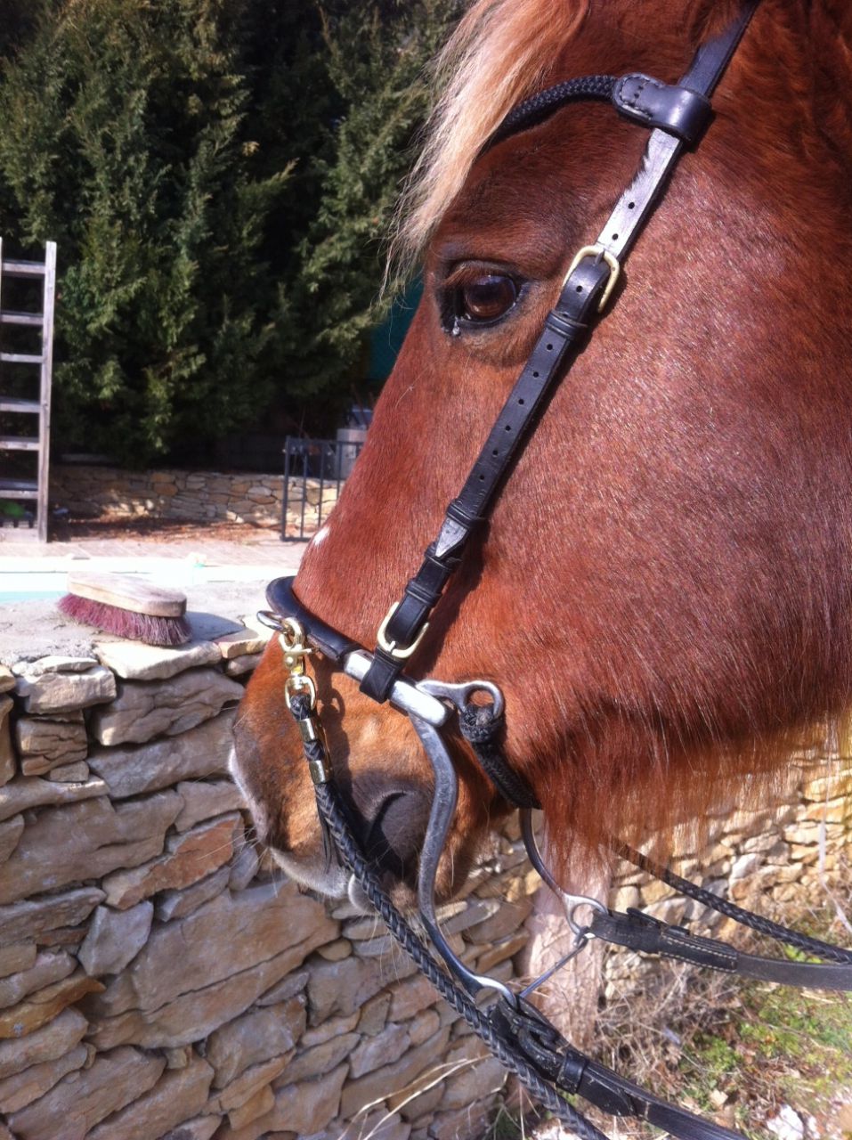 | Dire merci | pour eviter que les montants ne reviennent vers les yeux , un truc tout simple, equipez vos filets d'une sous auge, ( systeme D: prenez un vieux frontal en taille cheval ( 38/40 cm de long) que vous placez a l'envers sur les montants du filet. Vos montants ne bougeront plus![]() |