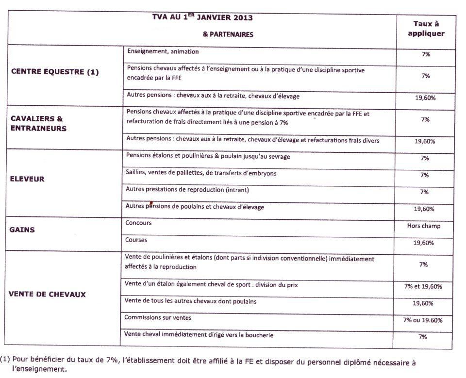 | Dire merci | Sauf que le décret n'est pas passé. Pour le moment il est illégal dans une structure équestre (pension déclaré comme telle, avec utilisation sportive des chevaux ) de facturer une TVA à 19,6% .... |