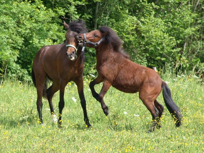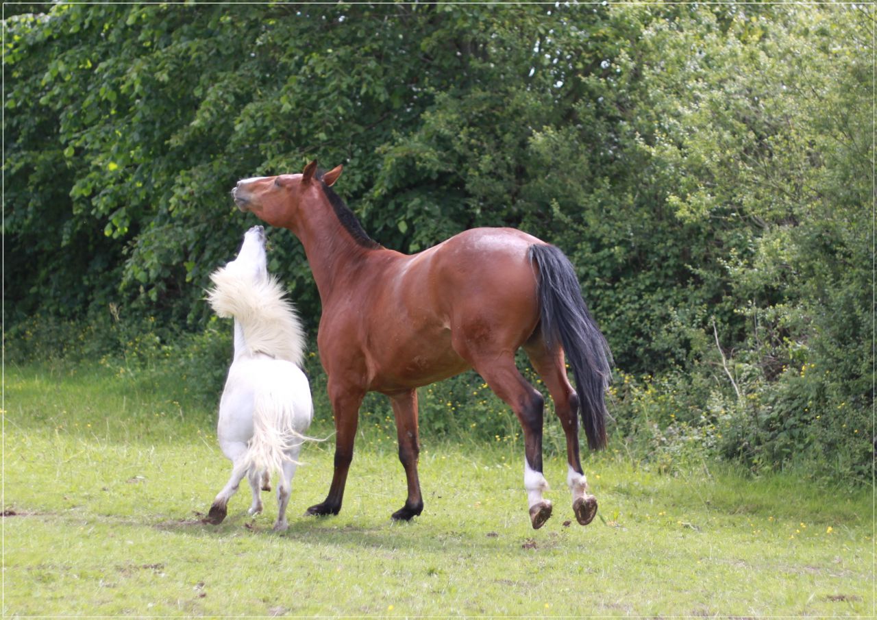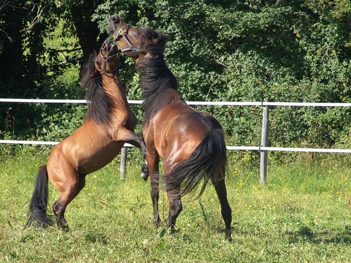 | Dire merci | A la maison, Chapy (3 ans, paint caractériel ) est avec papy Bij' (18-20 ans, shet') et c'est pas le jeunot qui fait la loi, loin de là. Minipouce est le chef de la prairie et de partout ailleurs (et il le fait bien vite comprendre, sans être méchant). Meme quand il joue, le jeunot fait attention mais papy a retrouvé une 2ème jeunesse avec lui L'été dernier on a ajouté une jument et là, c'était pas mal aussi. Le chef est resté le même et Chapy snappait devant la jument. Et la jument était dominée par papy |