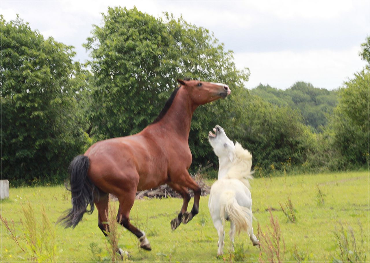 | Dire merci | mon oncle à un shet qui est parfois avec mon lusitanien et mon SF , mon lusi ne s'en occupe pas, en revanche avec mon SF c'est un peu la guerre ... j'évite de les mettre ensemble car le shet c'est déjà retrouver en dessous de mon sf qui s'étale dessus pour le mettre par terre .. ils ne se font pas de cadeaux entre eux ... ![]() bon le petit se laisse pas faire ! ![]() ils ne font que ce pourrir mutuellement ![]() ![]() |