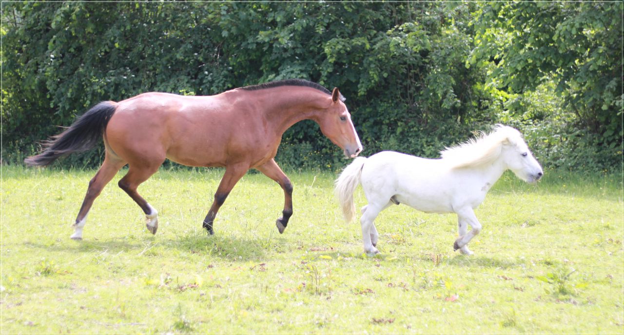 | Dire merci | Mon cheval, c'est pas avec un shet qu'il était, mais vu la format du mien, le rapport est équivalent je crois! ![]() ![]() Comme les deux étaient du style "au pays des bisounours", franchement, c'était cool cool. Même âge, même mentalité de gentil bébé joueur. Effectivement peut-être qui si l'un dominait l'autre ça devait être le nain. Par contre le souci avec la bouffe, c'était que mon gros était trop distrait. Quand ils avaient leur foin, le mien regardait les papillons et les petits oiseaux pendant que le morpion bâfrait tout ce qu'il pouvait! Total, pendant le mois où ils ont été ensemble, le poney a grossi. (le mien a perdu, mais il était aussi là pour ça). D'une façon générale, le seul gros souci que ça peut poser c'est la bouffe, et les besoins alimentaires différents d'un nain rustique et d'un grand. |