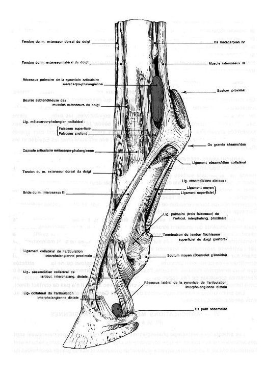 | Dire merci | Euh, cyberds, je ne crois pas me tromper mais "distal" (éloigné), "proximal" (près). Pour intérieur (médial) et l'externe (latéral). Donc l'attache ligamentaire distale, c'est l'attache basse du ligament. Le ligament collatéral... C'est celui qui part du devant du métacarpien et qui se sépare en 2 parties (collatéral) vers le côté du "sabot" (de la seconde phalange probablement). ![]() Pour schématiser, il part du bas du bleu marine (suspenseur du boulet) et finit de chaque côté du bas du rouge (tendon extenseur antérieur). Ouf, j'ai pas tout oublié. Il est donc normal que tu aies des chaleurs à différents endroits (insertions hautes, basses, gauche ou droite). |