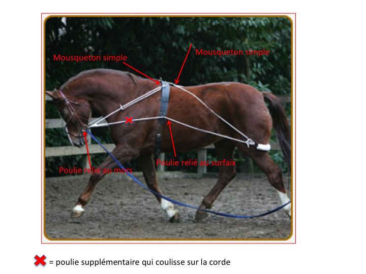 Dire merci | Le mien, tu as 1 mousqueton simple qui relie le surfaix à la partie qui passe derrière les jarrets, 3 poulies de chaque coté et un mousqueton simple en bout! |