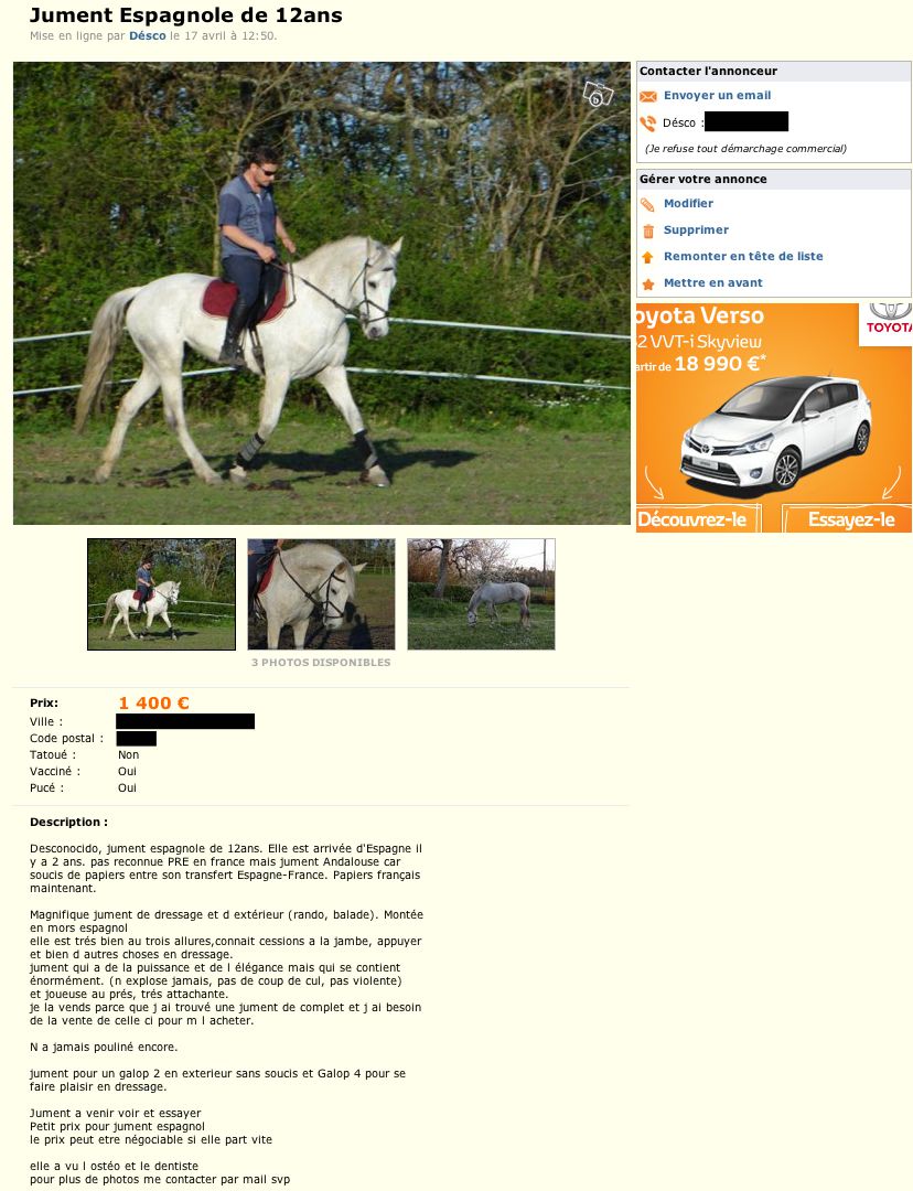 | Dire merci | La jument de l'annonce, la photo est petite pour comparer avec la tienne (puis c'est une PRE pas une PSL, donc çà change), mais remarque qu'elle a 4 ans de moins, et qu'elle est montable par un galop 2 ... et "que" à 1400 euros |