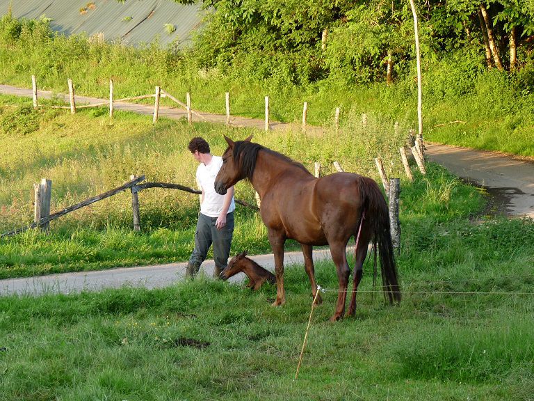 Déconnecté | Lorsque ma pouliche est née, la jument a été séparé de mon hongre un mois avant la mise bas prévue. Il pouvait se voir et se toucher. Pendant la mise bas le hongre est resté au coté de la jument (tout comme mon poney qui regardait a 100 m de la). Après la mise bas, la jument et la pouliche ont été mise dans un mini paddock rectangulaire avec 4 rangés de fils dont le plus haut a 1m. Au départ on avait pas mis le jus mais elle a traversé alors du coup jus. Jamais eu de problemes sauf les GENS, une horreur tout le monde rentrait dans le pré allait jusqu"au bord. La jument ne pouvait pas etre tranquille cinq minutes et moi j'en pouvais plus de gueuler et de me faire envoyer chier (bande de cons!!!). Au final il ma fallu plus d'une semaine pour pouvoir approcher enfin son bébé sans quelle ne stresse pffff. C'était une primipare aussi. Elles sont resté 15 jours dans le petit paddock et puis dans une plus grand parcelle. La pouliche avait un mois quand on a réintégré l'hongre. D'ailleurs c'était son petit bébé à lui. lol |