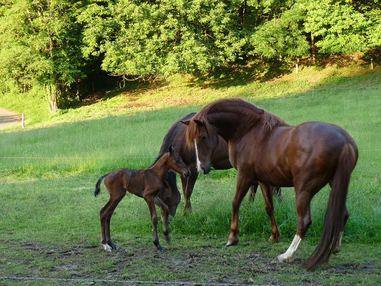 | Dire merci | Quand nos juments sont proches du terme (on a juste 2-3 poulinières qui en général sont a terme en même temps à peu de chose près) on déplace le troupeau à proximité et on installe une surveillance caméra etc. Elles sont au pré la journée, et rentrée la nuit quand les signes de poulinage sont présent et qu'il fait frisquet ou mauvais C'est arrivée qu'elles poulinent en plein jours, en troupeau et jamais eu de soucis, à part une très dominante qui cherchait à voler le poulain, mais là pas de risque de ton côté. Si ta jument sais remettre l'étalon à sa place et qu'il se connaissent bien, je pense pas qu'il y ai trop de risques... On a eu un poulinage le 3 février l'an passé, il faisait des -15 / -20 donc jument qui était rentrée en stabu dès les premiers signes de poulinage imminent. Mais la nature est étonnamment bien faite, le poulain est né avec une véritable toison d'hiver !! Pour ce qui est des clotures, le poulain de ma première jument avait un don pour ça... il s'endormait au bord des fils et se relevait souvent en se prenant dans les clôtures... il s'est d'ailleurs fait quelques bobos jusqu'à comprendre un peu les choses (le premier mois je dirais) Par contre il ne retrouvait pas comment repasser seul du bon coté de la clôture, sitôt séparés mère et poulain paniquaient, l’intérêt c'est qu'on etait jamais bien loin donc quand on entendait la jument appeler en panique, on intervenait vite. |