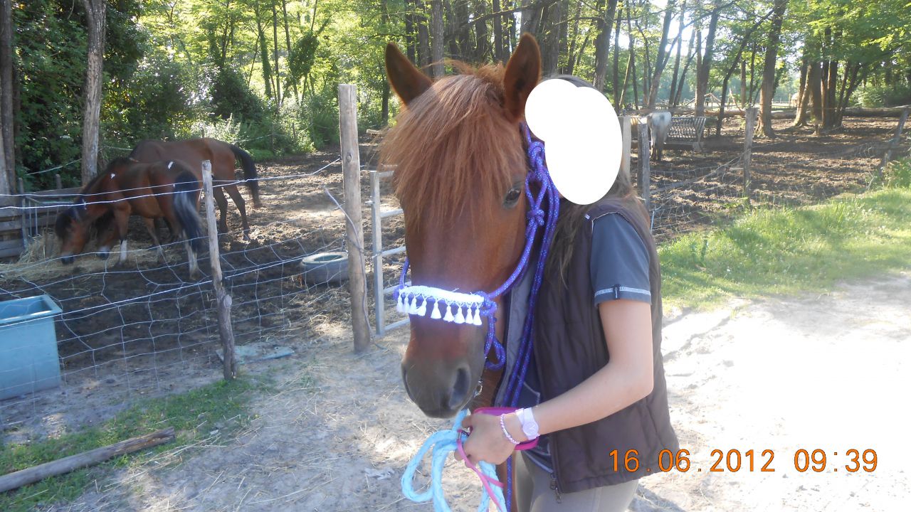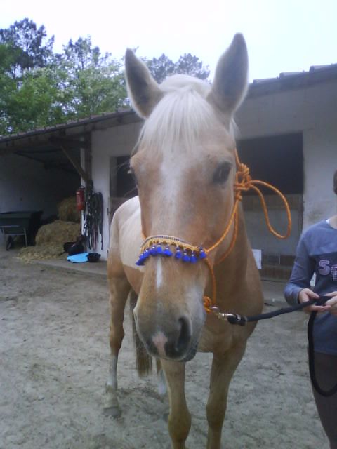 | Dire merci | merci je pense que je vais trouvé mon bonheur !! j'ai deja fais deux licol avec de la corde pour alpininiste un pour moi (l'orange ) et l'autre pour une amie (violet) sur le mien j'ai beugué dans les neuds ce qui m'a fait cette boucle |