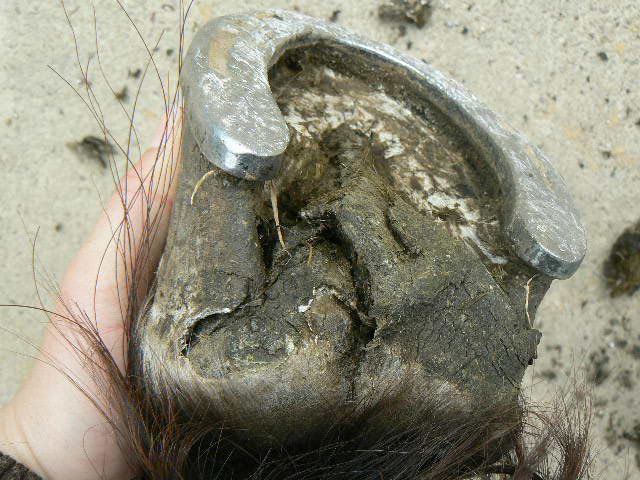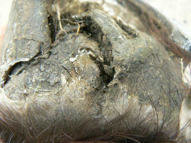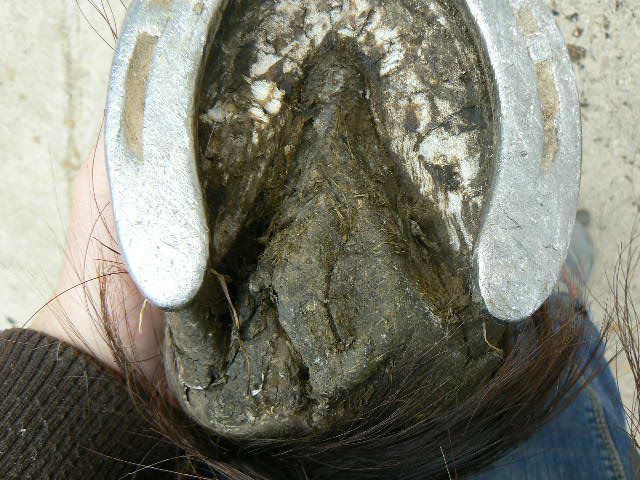 ca a commencé par un glome qui saignait , j'ai désinfecté, passé un goudron sur le sabot, ca a rendu le tout plus "jolie" mais là on dirait que sa fourchette est coupée en deux dans la longueur