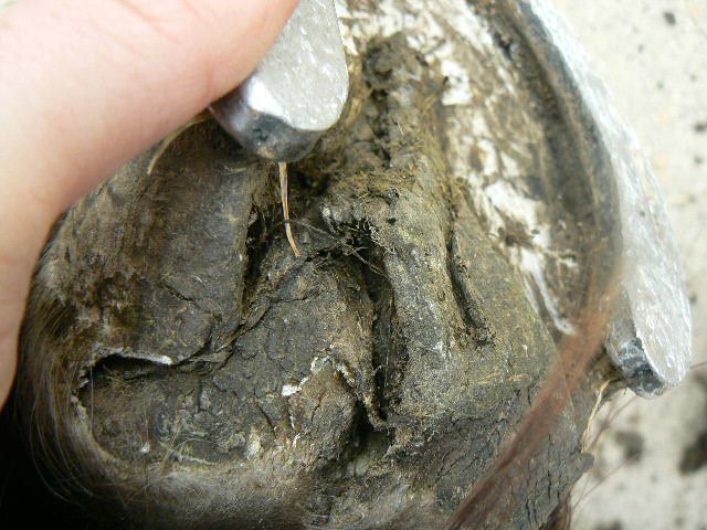 DéconnectéDire merci | Sortie d'abcès ou pourriture, pour savoir il faudrait retirer la partie de la fourchette qui se détache. Bien nettoyer mais je ne mettrais pas de goudron qui a tendance à 'enfermer' les bacteries et à stimuler l'effet bouillon de culture vers l'intérieur. |