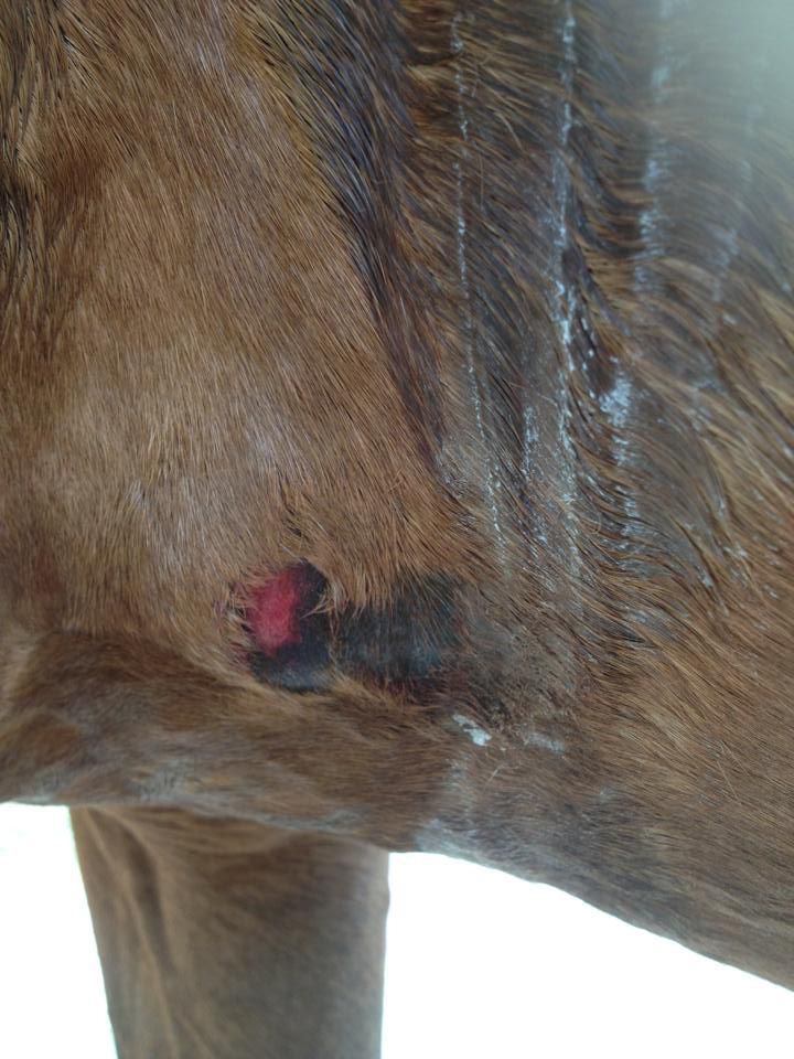 | Dire merci | Je n'ai la jument que depuis 4 ans, elle a 16 ans et son ancienne proprio m'avait averti que c'était son gros et unique point faible. Après, ce n'est pas une blessure grave en soi, mais c'est sure que c'est quand même embêtant. En plus, elle a une sorte de kyste maintenant... je vais demander à ma véto ce soir s'il faut laisser comme ça ou éventuellement faire enlever? |