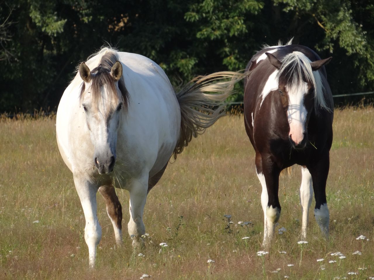 | Dire merci | une autre idée.... à voir si c'est applicable facilement ou pas : Faire un paddock d'herbe dans le champ dans lequel tu mets la grosse, la grosse, rationnée, va devoir manger moins au bout de quelques jours et quand y a plus d'herbe tu la passes au foin et elle reste au milieu nuit et jour (ou alors la journée tandis que l'autre est à l'herbe et les deux au paddock la nuit) Ca ne marchera que si tu sais mettre des clôtures provisoires solides et avec le jus sur secteur. Si tu risques d'avoir ce problème sur le long terme et que le terrain est à toi, mets des vraies clôtures. ça peut aller aussi si tu la mets dans un coin du champ mais l'avantage du système c'est qu'elle ne se sentira pas tant isolée, puisqu'au milieu de l'espace de l'autre... |