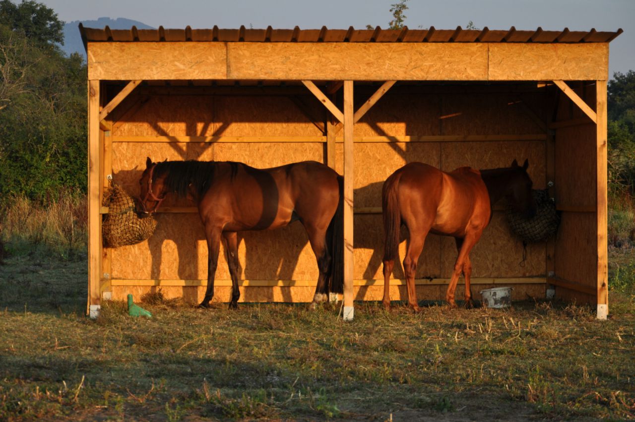 | Dire merci | oui mais l'abri protégerait des mouches et je pensais faire une porte pour transformer l'abri en box pour y laisser l'une des juments lorsque je sors l'autre en exterieur, sinon c'est un peu la galère... |