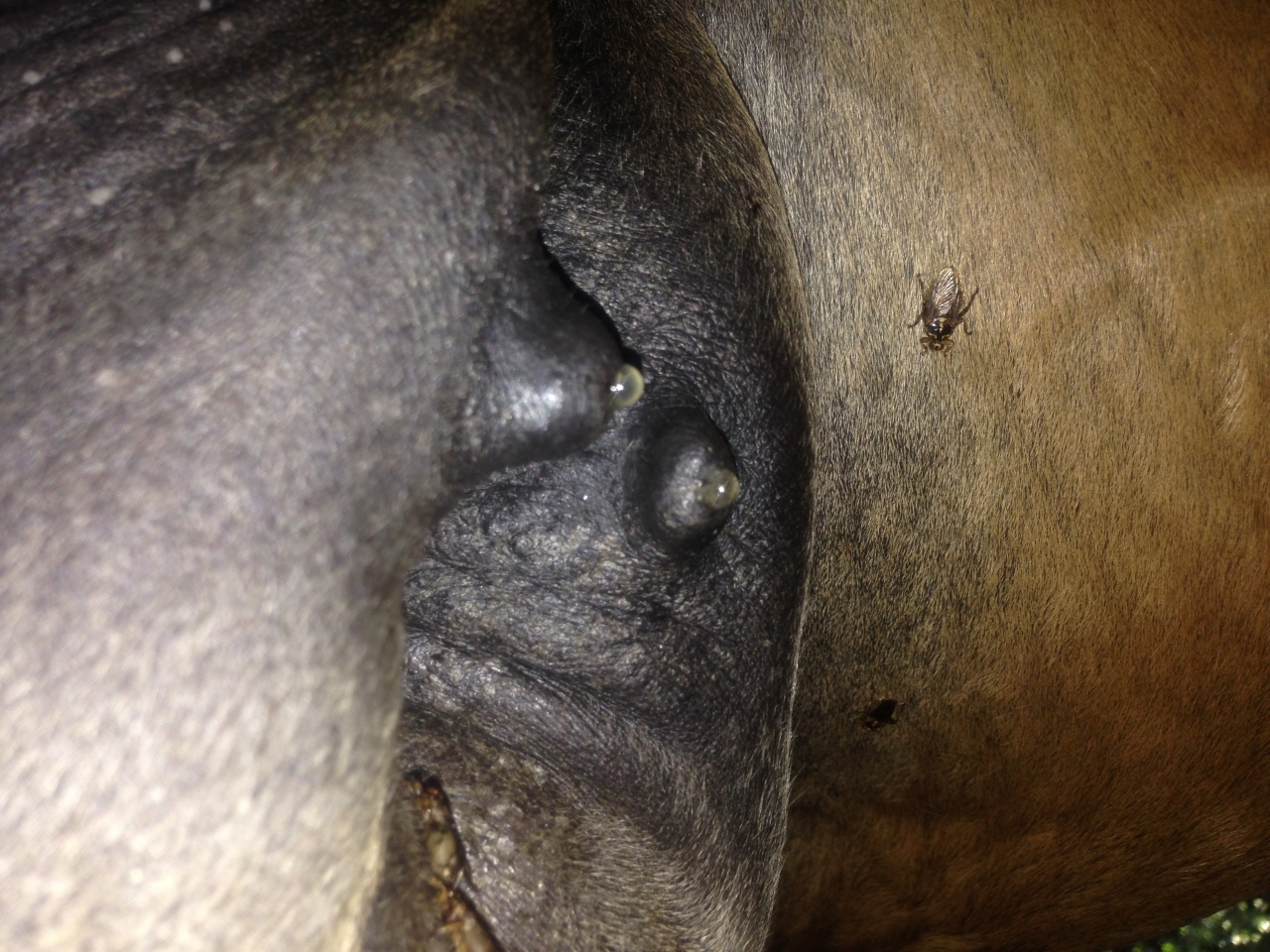 DéconnectéDire merci | non c pas stupide. il faut pas y toucher car si tu tire le liquide tu va lui en faire produire encore plus touche a rien et comme pour nous les femmes tu peut lui passer un jet d'eau froide plusieurs fois par jour dessus. Par contre si cela devient dur et chaud la c veto de suite car elle fait une mammite et c pas bon urgence |