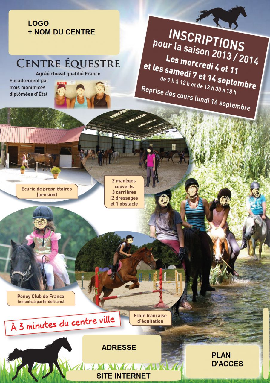 | Dire merci | Voilà le flyer qui va passer fin août dans les boîtes aux lettres (la photo à l'obstacle ne sera pas la même, et inversée avec celle du baby poney, mais sinon, cette ébauche est conforme au projet final) :![]() |