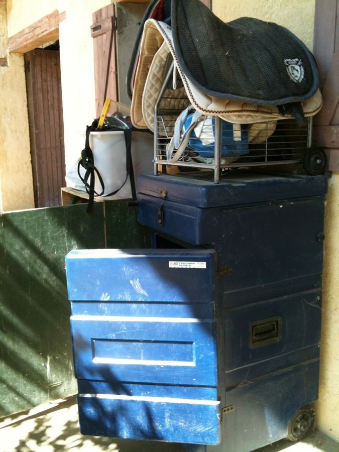 | Dire merci | Vahiquo, elle a une armoire transformer en sellerie sur son balcon .... et pour le reste c'est au écurie ... avec un minimum dans l'auto ( pharma, licol ). |
