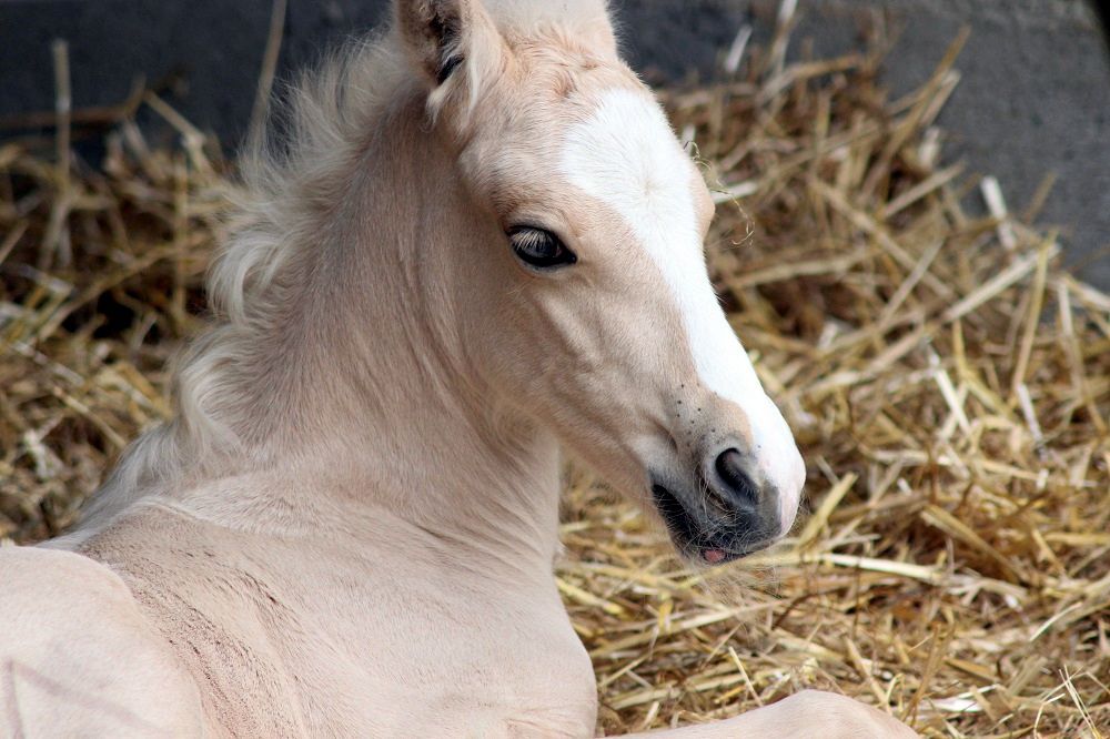 | Dire merci | La pouliche aux yeux clair est une double crème sur base alezane avec 1 gène gris, le principe est le même. Cette même pouliche quelques jours après : ![]() Et encore la même après : ![]() Et je n'ai pas de photo à 3 mois mais on ne distingue plus sa balzane et sa liste. Elle est certes double crème mais je peux vous trouver des photos de poulains palomino + gris avec muqueuse rose à la naissance, et des palominos sans gène gris avec des muqueuses violacés à la naissance. Ce qui fait la différence c'est le poil et les nuances, pas les muqueuses ! |