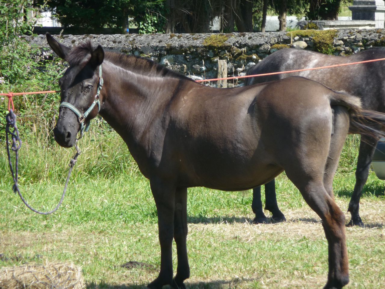 | Dire merci | Scooper : j'ai une mule aux écuries ... voilà 1 an et demi qu'elle y est !! J'ai finit par l'atteler .... mais il y a deux soucis : elle met du temps à faire confiance ( plusieurs mois ) elle fait 1m25 J'en demande 1200 et elle a 4 ans. J'avais un mulet Comtois X Baudet, je l'ai garder 9 mois ... plus valu sur celui la : 800 euros. Et j'attend un autre mulet ... couleur bai capé ! mère Comtois X Appalo et père Noir du Berry ... c'est un cadeau pour service rendu au proprio de la jument. Mais je suis pas sur de mettre en vente le Dream ... |
