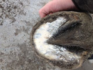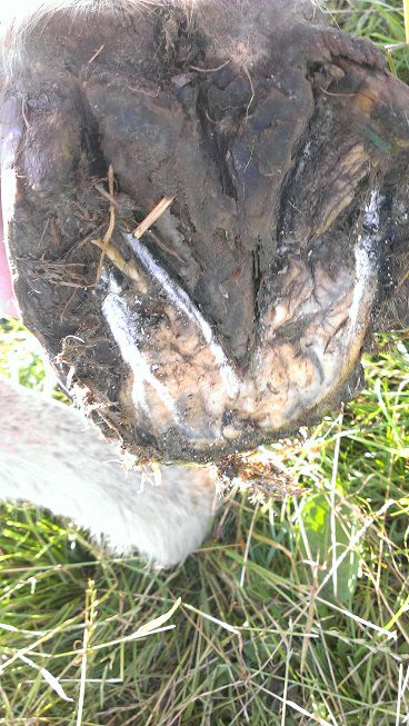| Dire merci | J'ai du mal à voir le soucis... La corne semble juste cireuse comme à tout changement de saison. La ligne blanche ne semble pas touchée, mais vu l'état du parage difficile de voir grand chose... Le javel n'est pas un produit à utiliser régulièrement car de mémoire il agit sur le collagène et les parois cellulaires... Et participe donc à fragiliser la corne. Bref, à part parer plus souvent et nettoyer au vinaigre blanc puis teatree je ne vois pas... |