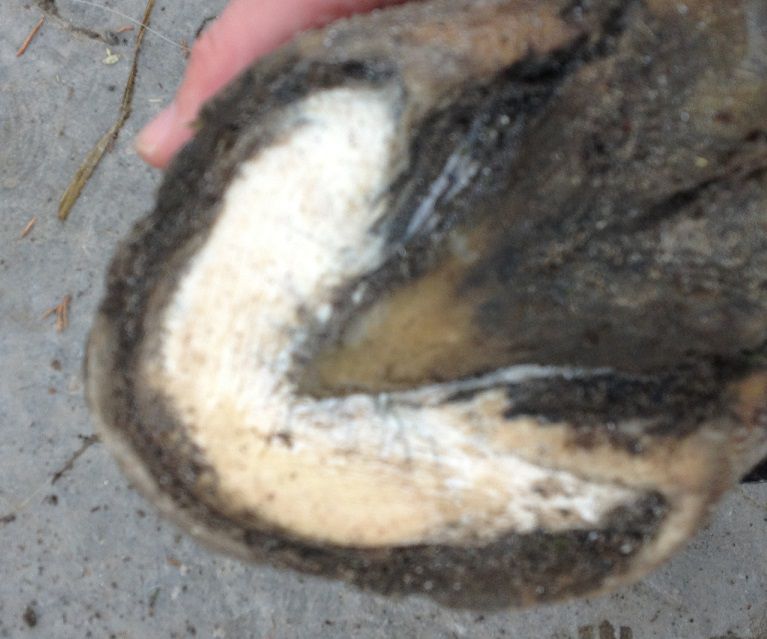 | Dire merci | Effectivement, là le pied me semble pas trop mal. L'idéal serait effectivement que tu apprennes à manier une rénette (ortho? bref, le mahcin coupant quoi) pour pouvoir aller grailler un peu la sole et la ligne blanche dès que tu as un doute et ne pas retarder le traitement/parage suivant. |