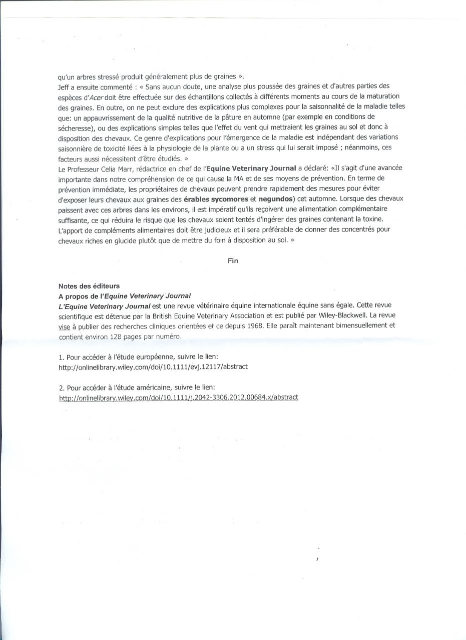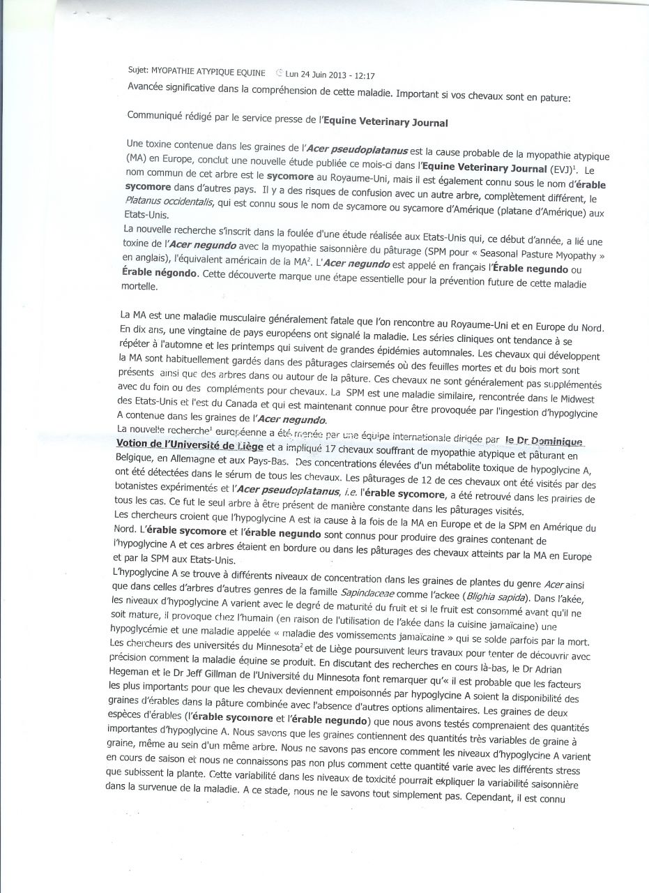 | Dire merci | Réunion d'information hier organisée par notre vétérinaire à l'intention des éleveurs et propriétaires de chevaux:en une semaine 3 cas dans notre secteur ( à l'est de la Haute Loire ) , 1 à Yssingeaux , 2 au Mazet Saint Voy. Les risques sont malheureusement maximum depuis qqs jours en raison des conditions météo .Les chevaux atteints ( et décédés ) étaient tous ds des prés où il y a des érables. Il est conseillé d'éviter de mettre les chevaux dans ce type de pâtures , si possible de les nourrir à l'intérieur et encore mieux de les garder dedans.......ce qui n'est pas toujours évident ! |