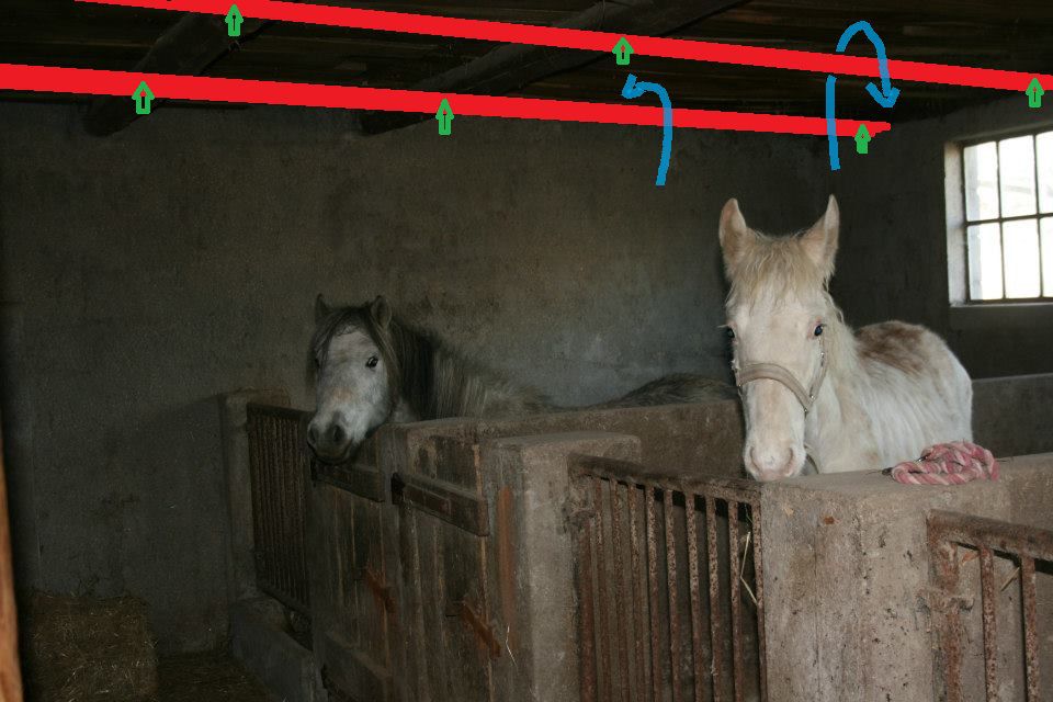 | Dire merci | 2 possibilités pour fixer de quoi soulever le cheval : 1) Il y a des poutres au dessus (elles supportent un plancher, 150 kg, ce n'est pas la mort, elles devraient pouvoir soutenir ce poids). Fixer à ces poutres des planches solides, avec plusieurs tirefonds de taille approprié, dans l'autre sens (pour reporter la charge sur plusieurs poutres). Vous vous servirez de ces planches pour passer les sangles. ![]() En rouge, j'ai figuré les planches, en vert, les tirefonds (ils faut en mettre plusieurs par zone d'ancrage, pas un seul, j'ai mis 1 flèche seulement à chaque fois pour ne pas surcharger l'image) et en bleu, le passage de sangles de soulèvement (pareil, mettre autant de sangles que nécessaire) 2) Le box est en dur. Il est donc envisageable de construire un portique à l'intérieur, qui prendrait appui sur les murets du box, à la base des murets. (très schématique !) ![]() Trouve un portique de balançoire pour enfants qui passe dans l'écurie en taille, et monte là dans le box. 150 kg, c'est bon, ça supportera ce poids là. Après, quand tu n'en aura plus besoin, tu pourras toujours la revendre. |