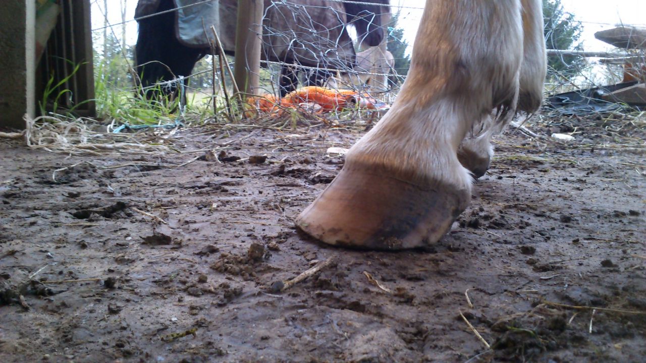 | Dire merci | Et je ne trouve pas que le pied soit spécialement long (pas d'urgence en tout cas). La muraille en pince semble bien suivre l'axe du pâturon, même si le talon est plus haut que sur la plupart des miens. Kaira par exemple a besoin de talon pour que son pied fonctionne correctement. |