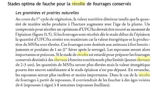 DéconnectéDire merci | En fait, pour les chevaux, mieux vaut faucher en pleine épiaison car le foin contient moins de sucre. Donc avant trop riche (bon pour les vaches à lait et viande) et après trop grossier |