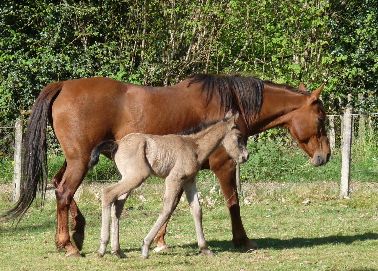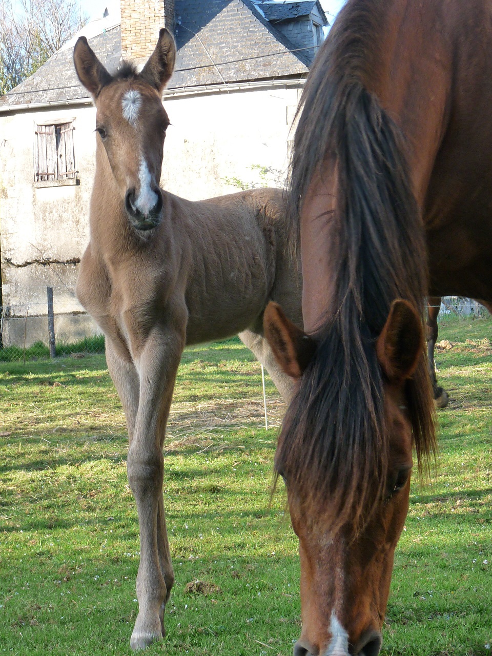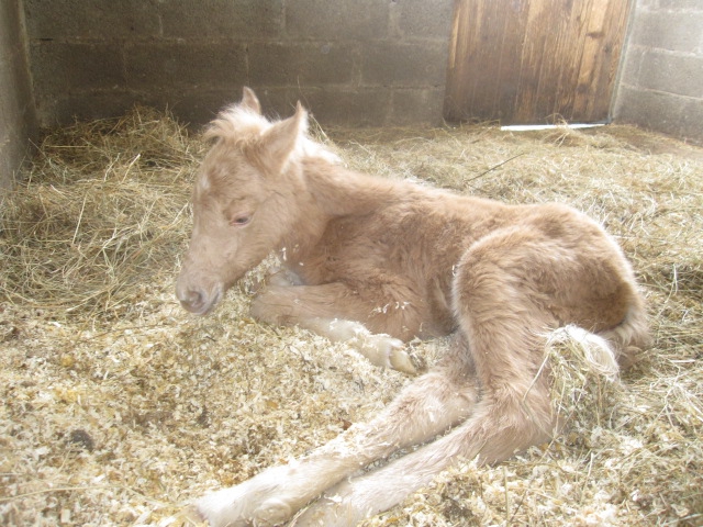 | Dire merci | a 5h00 ce matin 15/04/2014 est née une jolie pouliche, après une bonne nuit blanche pour moi ! bien vigourette, c'est la fille de * Kahla ponete ONC isabelle de 1m15 (top ponette de club tout niveau et compet cso cce) et de *Tic Tc des Bordes, shetland palomino PP (gentil poney sort en cso bien classé, avec des petites cavalières, championnats etc) E....... de l'Hacienda |