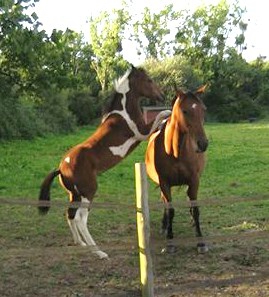 | Dire merci | Aujourd'hui j'ai failli tuer Eyota ![]() Sorti Diamond et la piote pour les mettre dans le hangar en face du parc (=> 10m à faire). J'ai paré Diamond, pendant ce temps la piote a fait le tour du hangar et du parc qui en fait le tour. Après parage + pansage + gratouilles, je veux rentrer Diamond au parc, et là la miss fait mine de pas nous voir et nous snobbe ... Se barre au fond du parc plein pot, revient plein pot (et se casse la gueule!) et s'en va bouffer les prunes un peu plus haut au bout de 15min j'en ai eu marre, j'ai dénoué mes fils, j'ai fait une séparation entre le hangar et le reste du parc, attaché Diamond à un piquet DANS le parc (merci pour ta patience ) et bien sûr Eyota avait décidé non pas de retourner chez maman, mais faire l'inspection de l'intérieur du hangar j'ai fini par lui courir derrière, armée d'un vieux bout de gaine , et elle est rentrée vite fait bien fait dans les jupons de sa mère cette enflure!Dans 1 mois et demi les boxs seront montés, ma pauvre ça va chier |