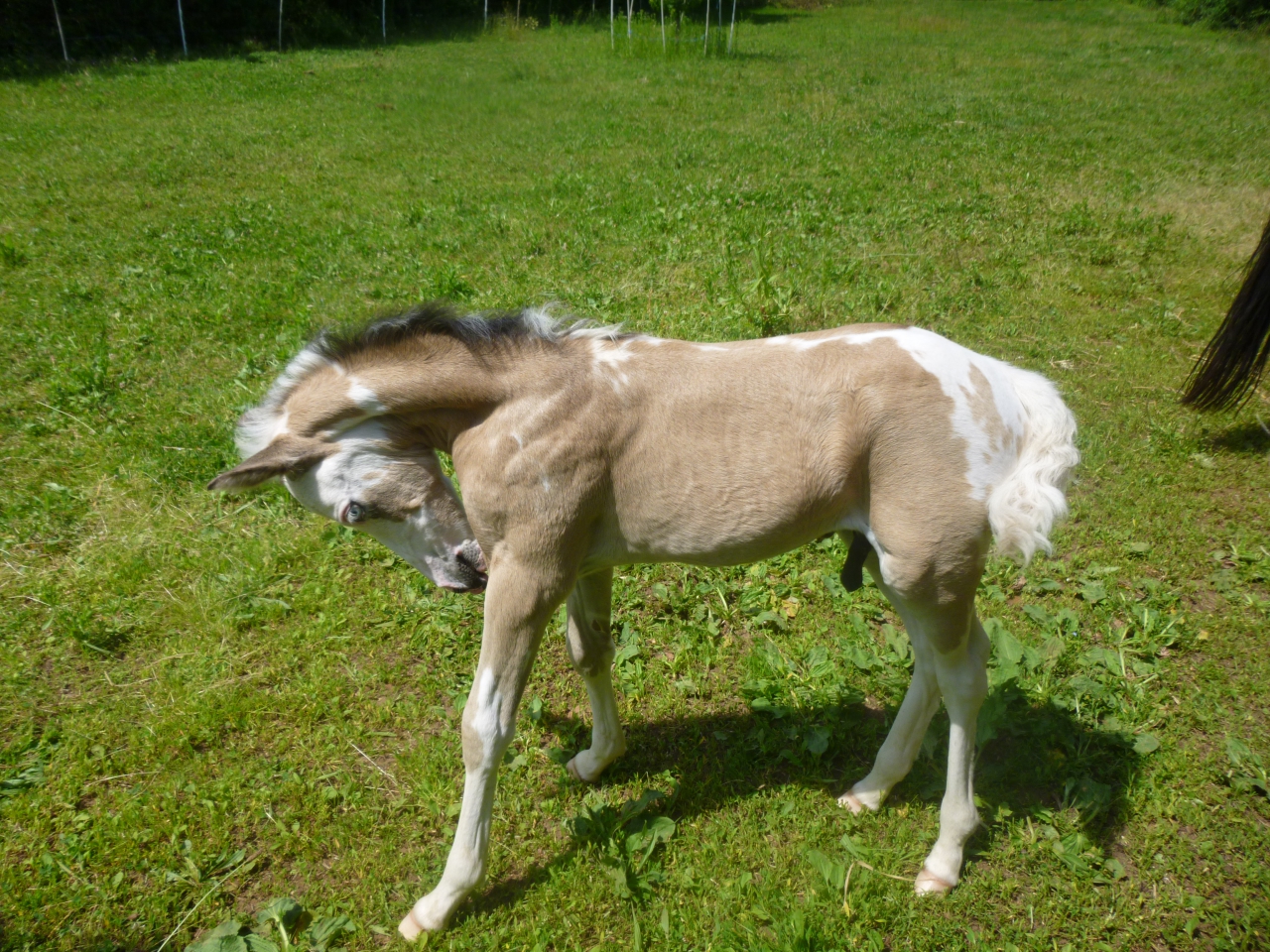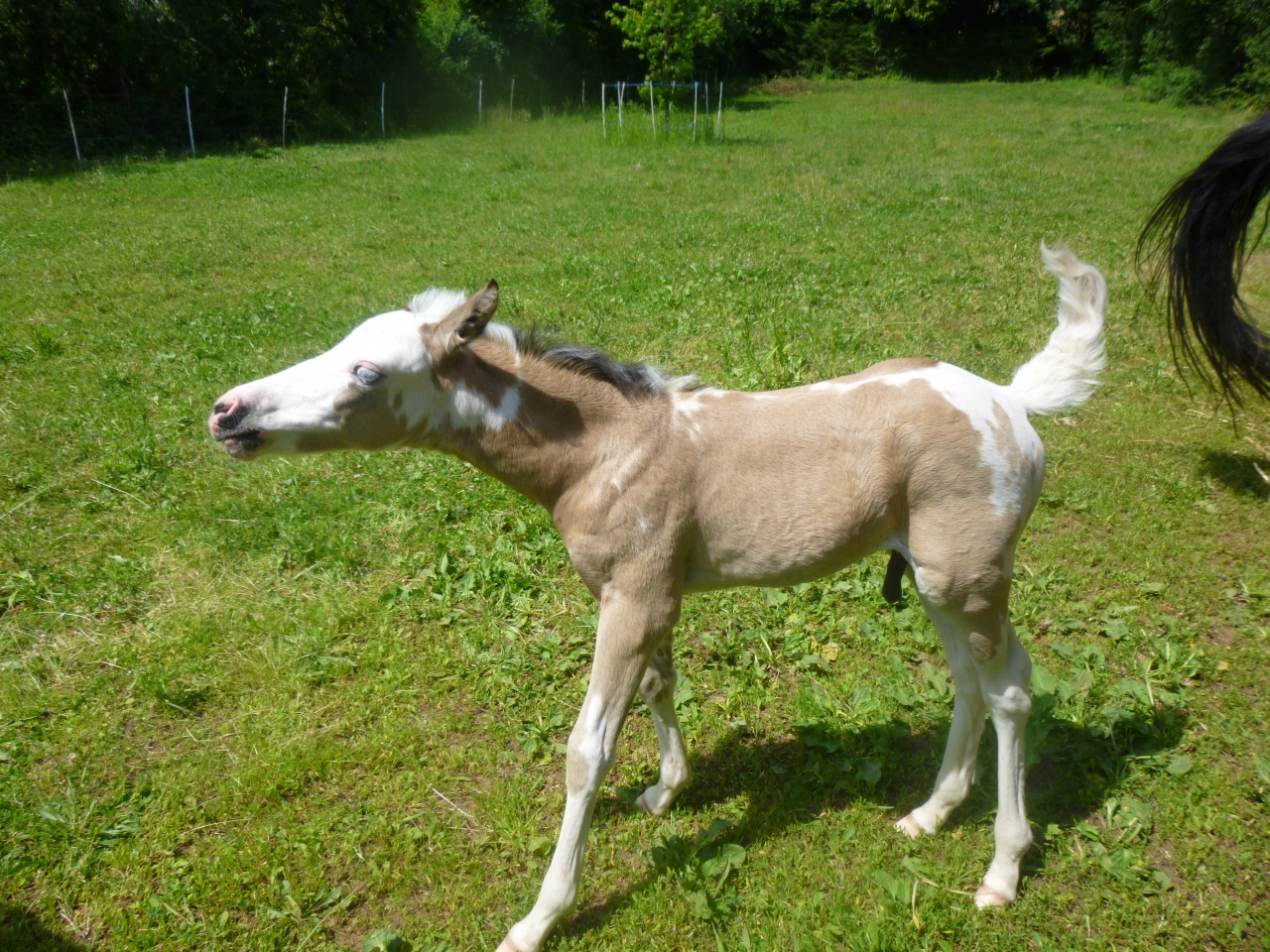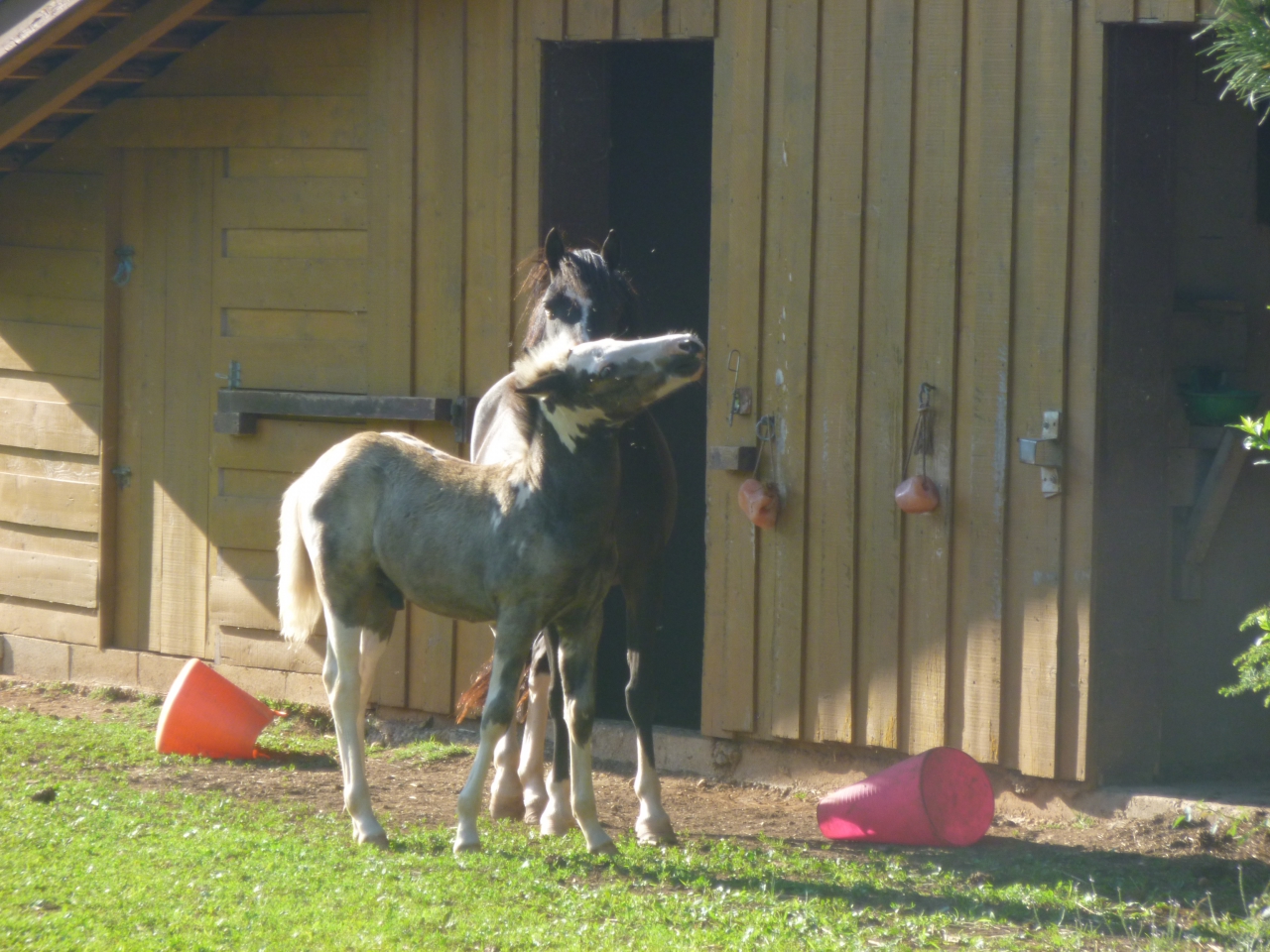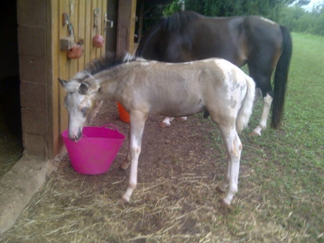 | Dire merci | des nouvelles de notre petit EASY UP, né le 21 mai dernier. très joueur, très proche de l'homme. il accepte parfaitement le licol et donne ses pieds. reste à lui apprendre à marcher en longe et l'attache. mais bon, on se presse pas J'ai un mois ![]() ![]() j'ai deux mois ![]() ![]() et j'ai "presque" trois mois. je suis en pleine mue, c'est moche.... et je vais manifestement devenir isabelle fumé....(semblerait donc que maman soit bien bai sooty...) ![]() ![]() ![]() |