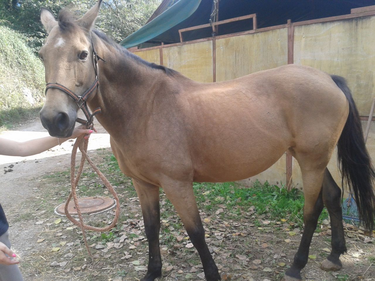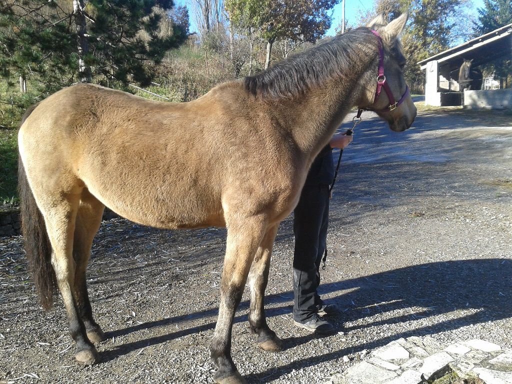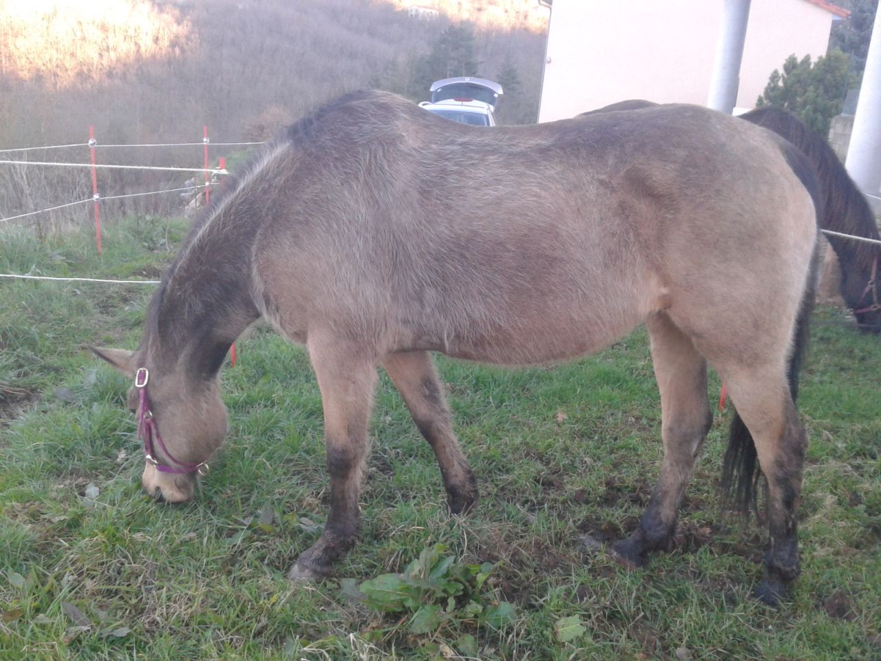 | Dire merci | Poney Isabelle a la maison, a la mue a l'intersaison l'encolure et le eau des fesses est casi noir .. la mue fini il redevient normal (et il est trés clair l'hivers avec son gros poil) |