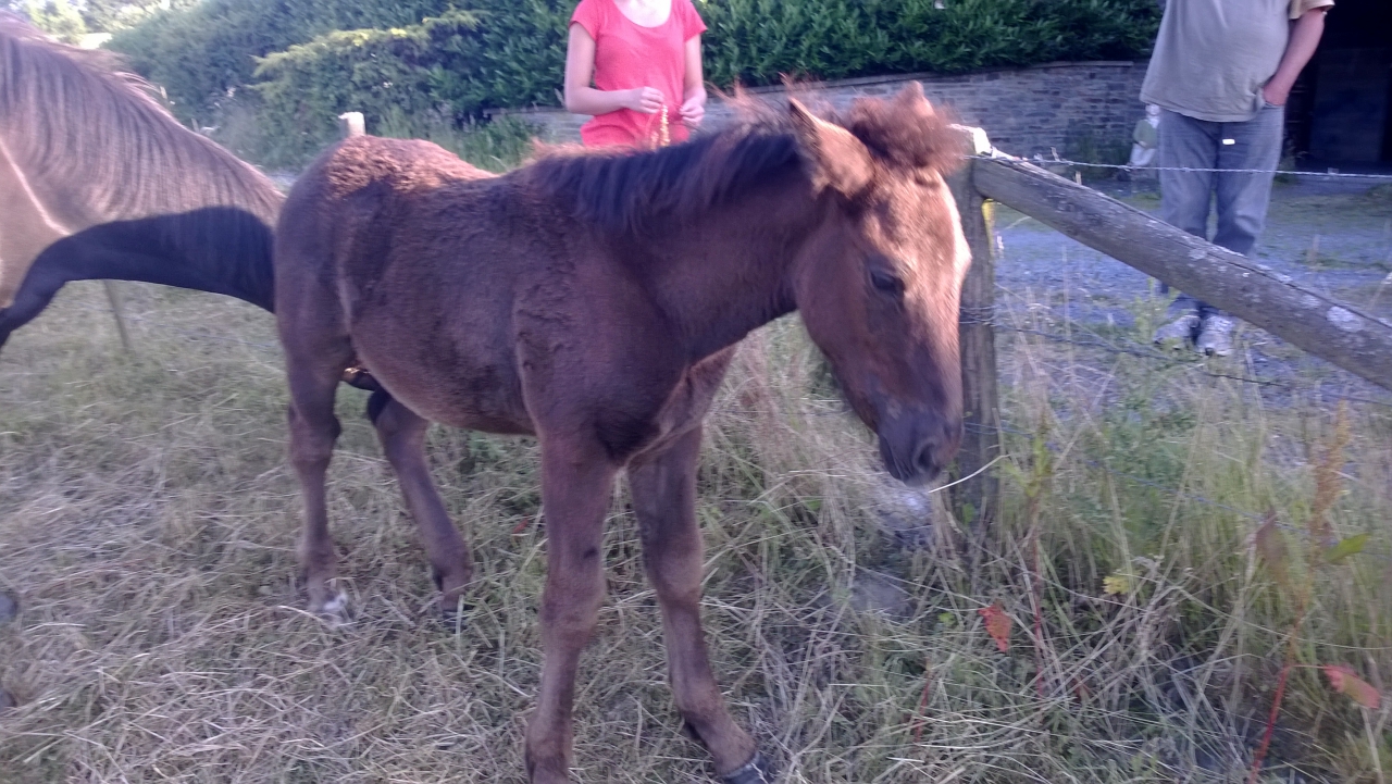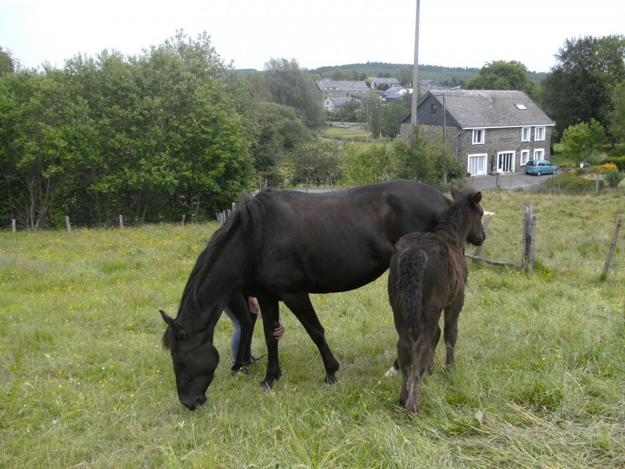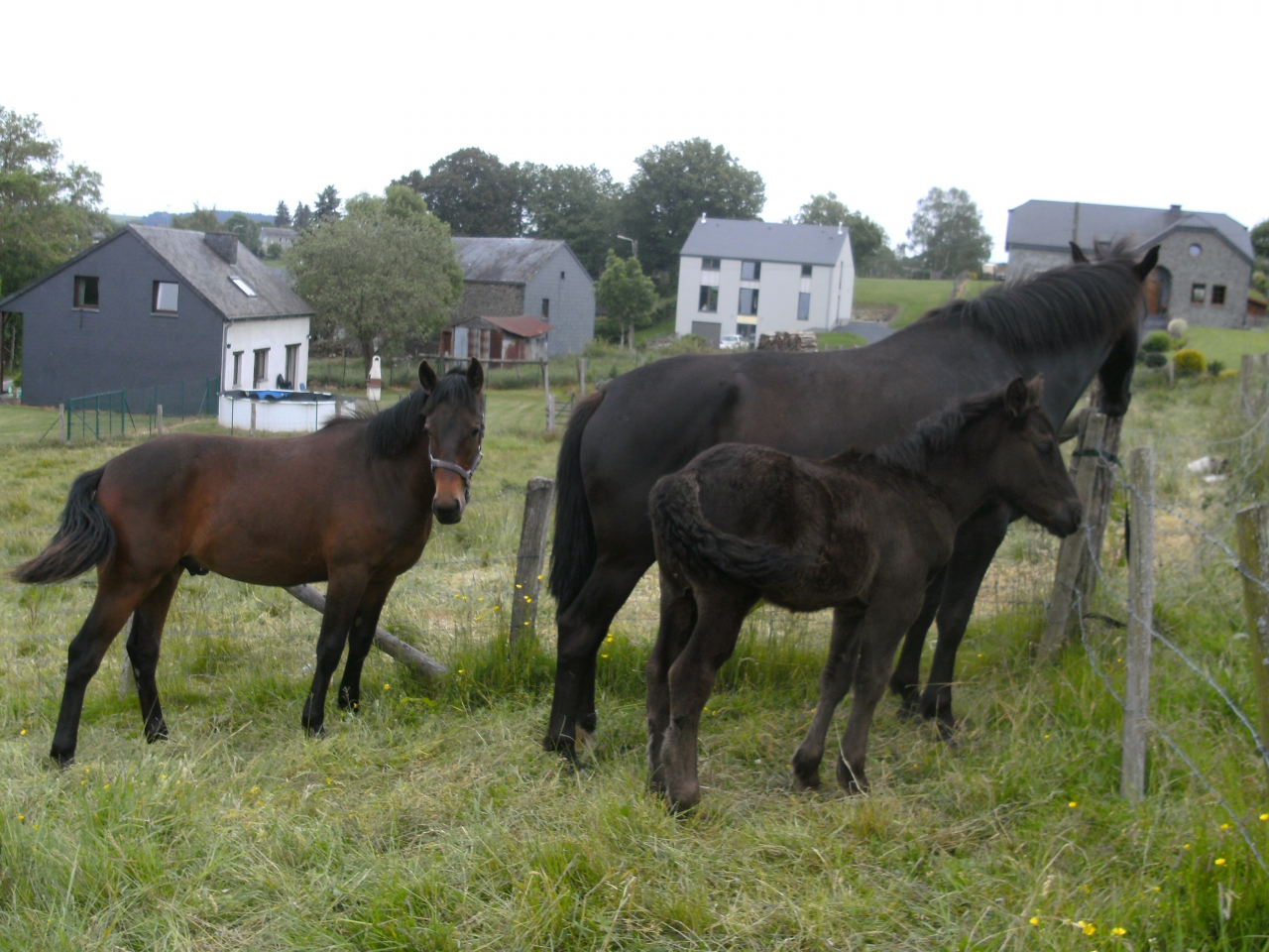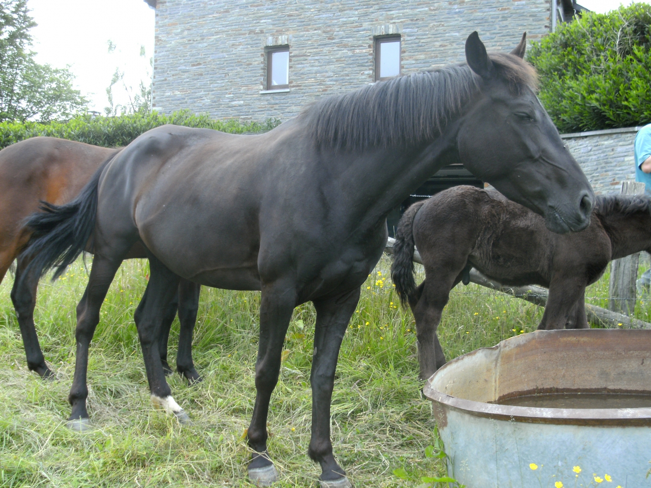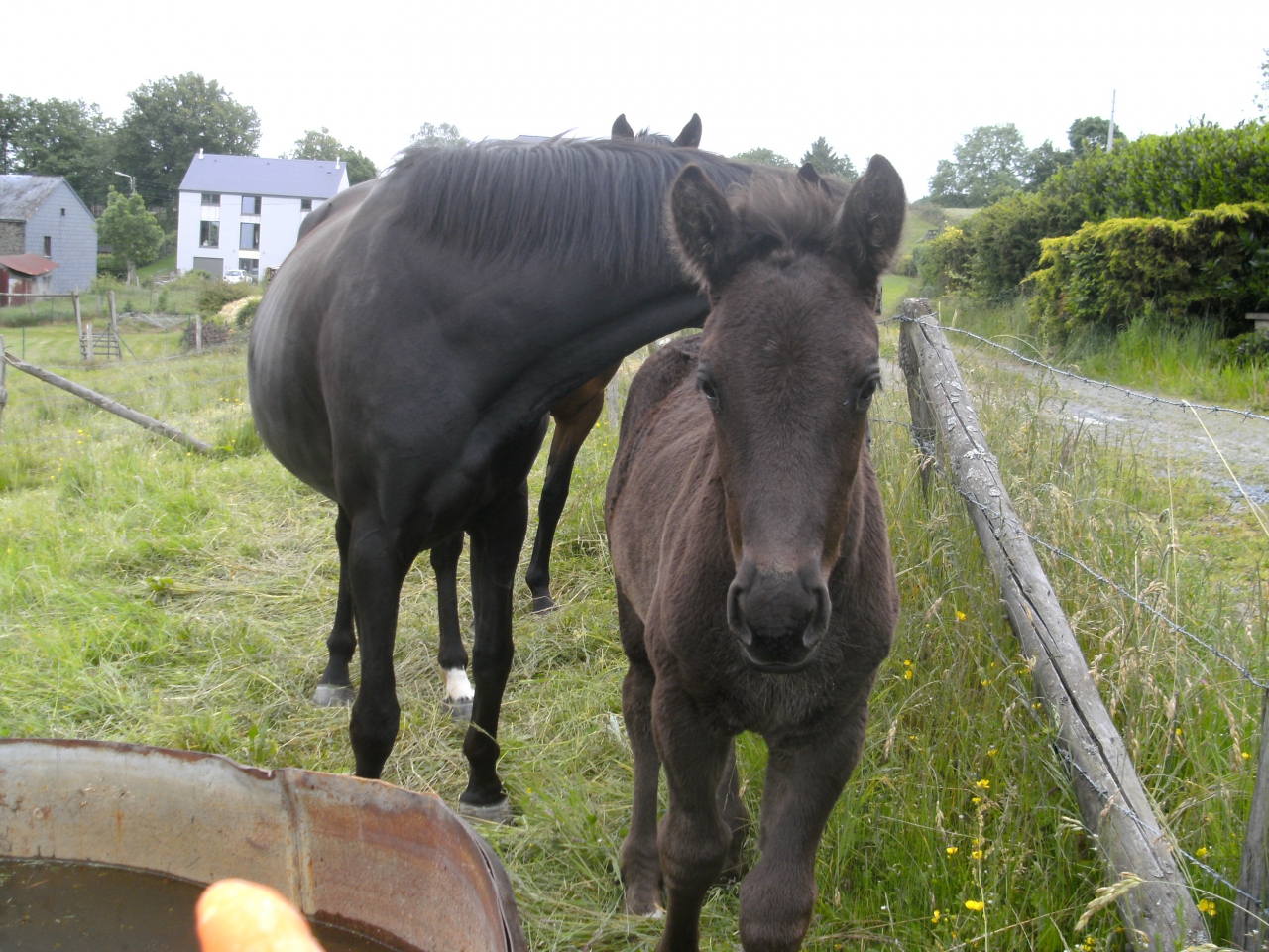 | Dire merci | Bonjour, j'ai fait une super découverte ce jeudi soir ! Ma jument m'a fait un petit poulain surprise Je ne l'ai que depuis fin juin et personne n'a remarqué qu'elle était pleineJe ne sais donc pas qui est le papa ... Mais j'ai en tete qu'il y avait un étalon de trait là ou elle vient... Je vous demande votre avis, j'ai l'impression qu'il est bien osseux le petit ! sur les photos il a 1 jour Il a des poils blancs en dessous du ventre et un peu partout sur le corps, je me demande si il va rester noir ![]() ![]() |