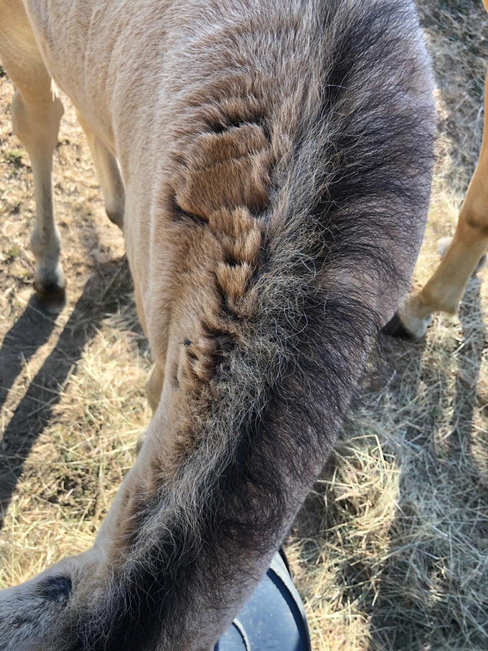| Dire merci | Ici malheureusement on a vu ce que ça donne en application pure. J'en ai commandé chez les vétérinaires sans demander si elle serait pure ou diluée. J'ai dû m'absenter 3 jours, une autre cavalière est donc allée prendre la commande. Elle a bien demandé à la secrétaire comment appliquer car rien écrit sur le flacon, celle-ci lui a répondu qu'il fallait juste mettre sur le cheval... heureusement dans notre malheur je lui avait demandé de mettre juste un peu sur la ligne du dos et le toupet. Bon résultat, 7 de mes chevaux et poneys plus ou moins cramés dont un poulain de moins d'un mois. Ça a cloqué et la peau finit de partir. L'avantage si on peut dire c'est que le côté aseptisant, cicatrisant fait qu'il n'y a pas eu d'infection et que quand la peau part, la repousse des poils est commencée. |