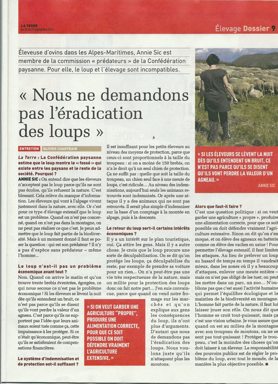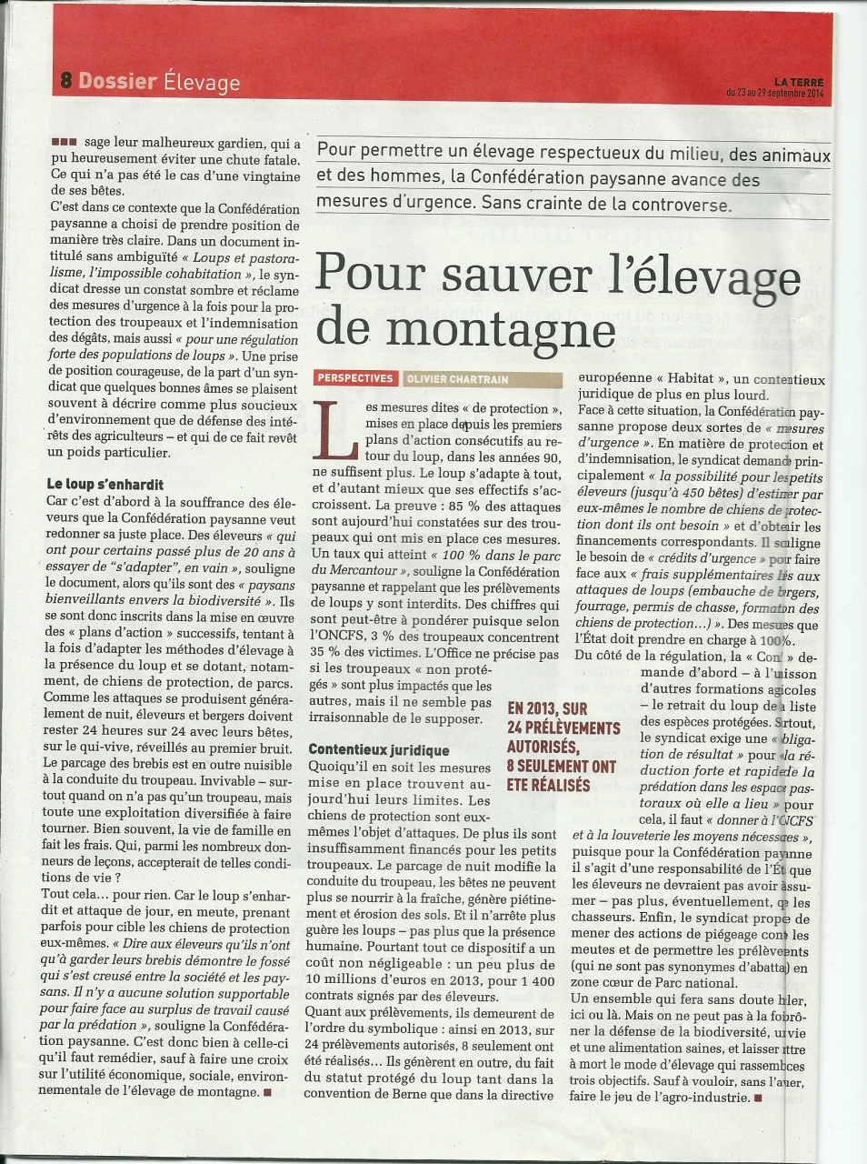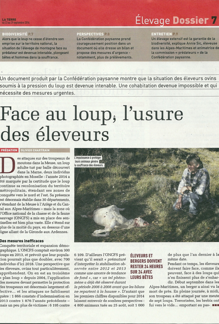 | Dire merci | Aller, petit remontage de post polémique.... ![]() Je vous mets un extrait du journal "la Terre" de cette semaine, dont la couverture titre: l'élevage ou le loup, faudra-t-il choisir? Pour info "la Terre" est un journal du gauche, fondé par Waldeck Rochet,très proche de la Confédération paysanne......qu'on ne peut donc pas accuser de servir la cause des gros conducteurs de tracteurs verts (et jaune ou rouge). ![]() ![]() |