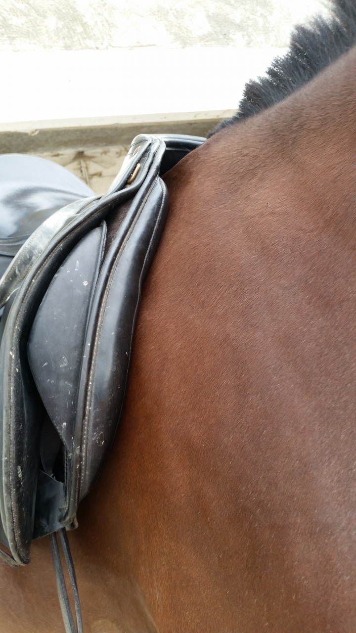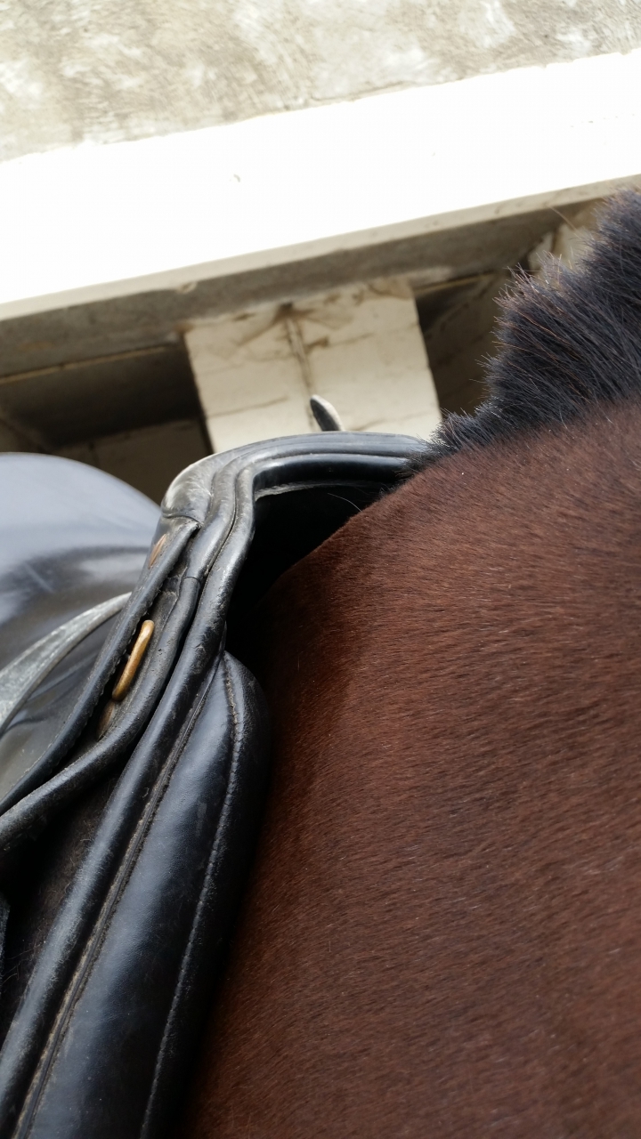 | Dire merci | Perso, je n'attendrais pas que mon cheval ait des taches blances pour le faire voir a un saddle fitter, afin d'etre parfaitement sure que la selle correpondre. Sinon oui l'ouverture a l'air d'etre une taille trop large. |