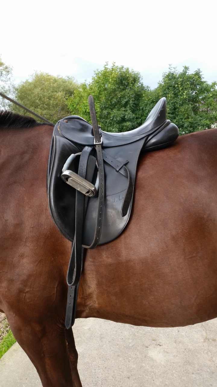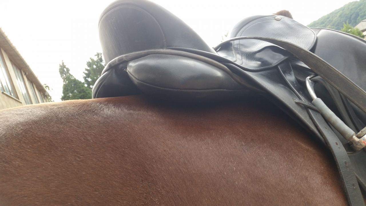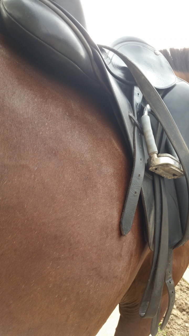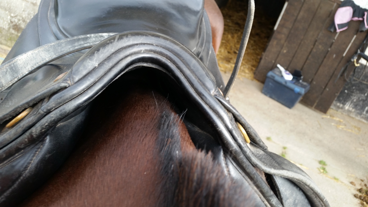 | Dire merci | Tu pourrais essayer ta selle avec juste un tapis blanc coton fin pour voir les traces. Puis tu refais la même chose (tapis propre) avec une arcade moins large. Là quand tu es en selle, tu mets combien de doigts entre le pommeau et le garrot ? |