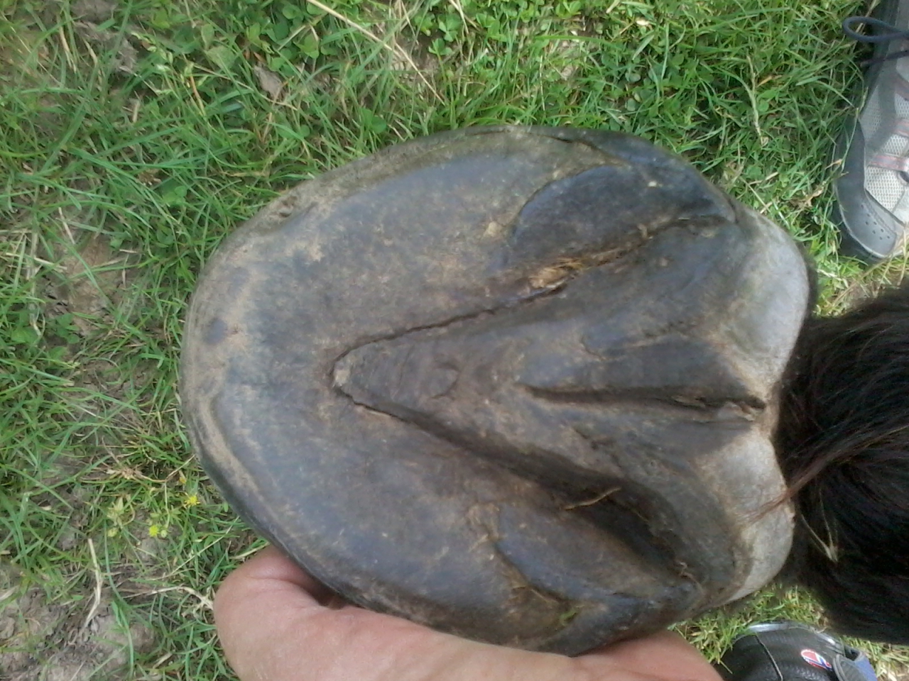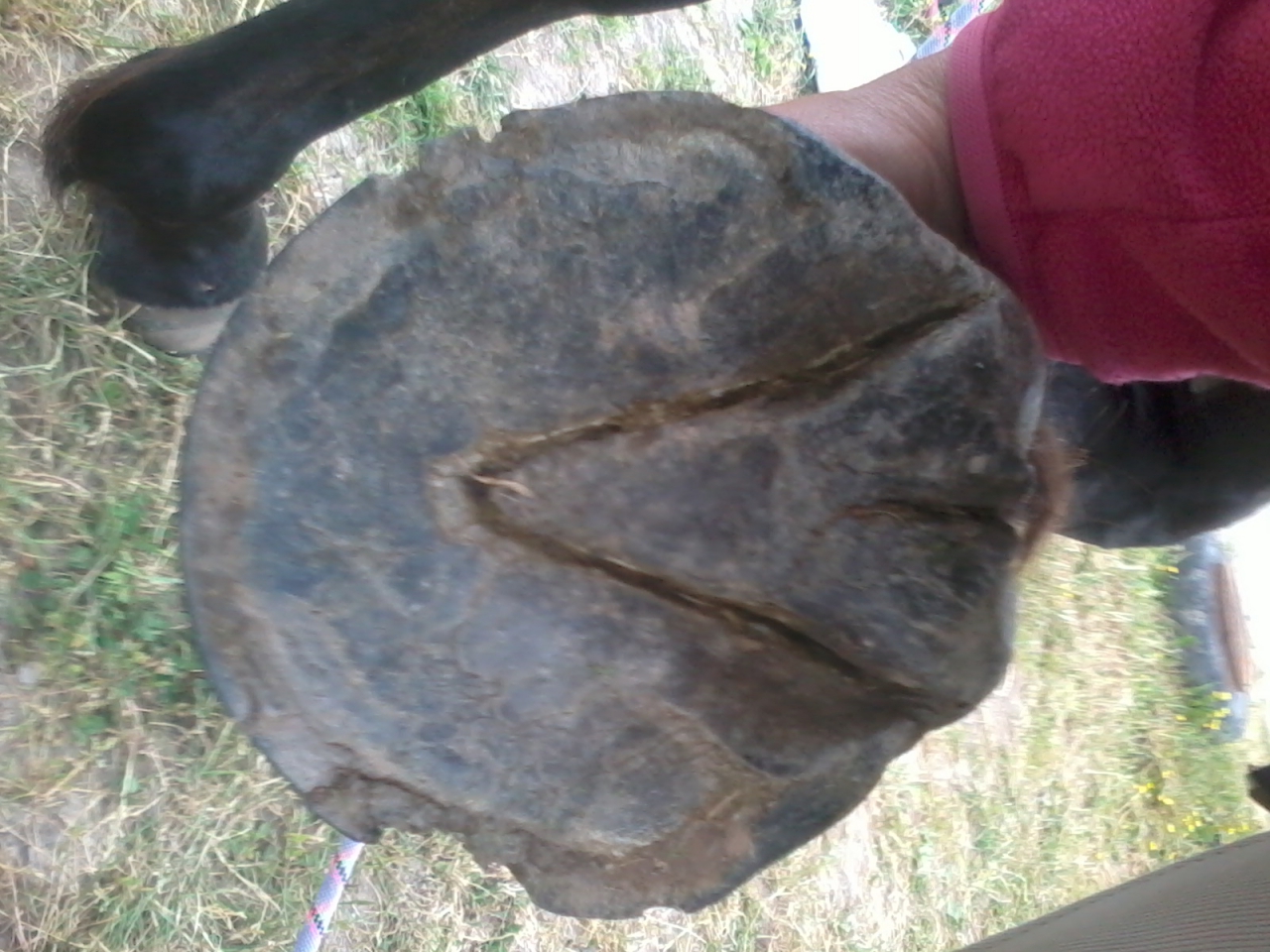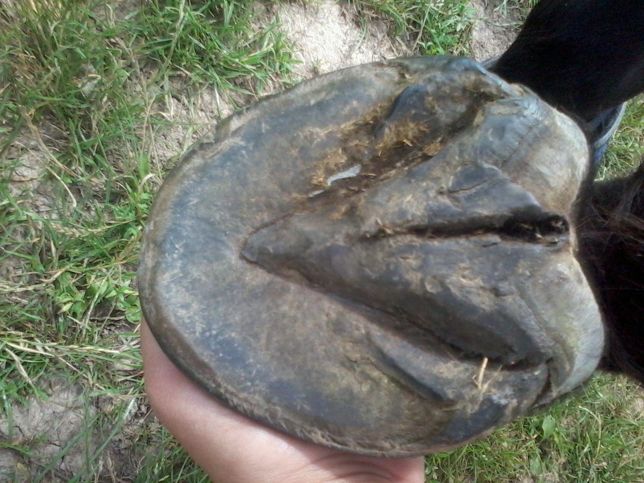 | Dire merci | Salut carococo je voulais avoir des nouvelles de tes pieds de PS. Après bien des misères j'ai fait déferré mon réformé des courses, qui défferrait et cassait de la corne, ça devenait dangereux. Les postérieurs ça va, je les ai déférrés et j'ai pu monter en carrière après 5/6 jours sans problème. Pas de sensibilité. Déferrage des antérieurs : boiterie au pré pendant 8 jours, et depuis ça va au pré mais extrème sensibilité ( je pense que mon cheval est très expressif à la douleur aussi). Il n'avance pas même avec des sandales. Par exemple il n'est pas montable même en carrière,il est trop mal à l'aise. Je viens de lui acheter des semelles pour mettre dans ses sandales.... En gros : combien de temps pour que les pieds s'améliorent ? Est ce que c'est juste la forme du pied qui s'améliore ou aussi la corne ? Mon cheval est au pré, mange de l'herbe et du foin ceci depuis décembre. Je vais le voir en pension 4 fois / semaine. Je nouris le sabot avec de la graisse à chaque fois. Je donne des cures de biotine 2 x par an. Il a la corne fine et friable. Le pied plat (plus que le premier en photo). Je vais faire venir un pareur spécialisé dans le pieds nu, mais je vois bien que c'est pas simple pour un PS. Ca me rassurerait d'avoir un délais aproximatif pour voir si ça suit un cours normal... |
