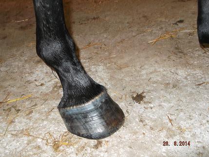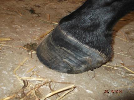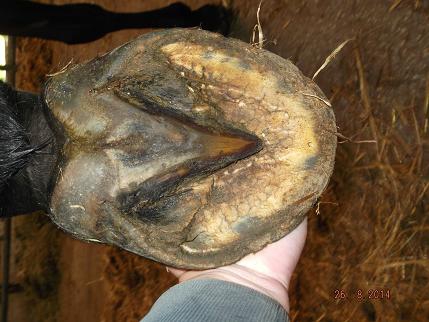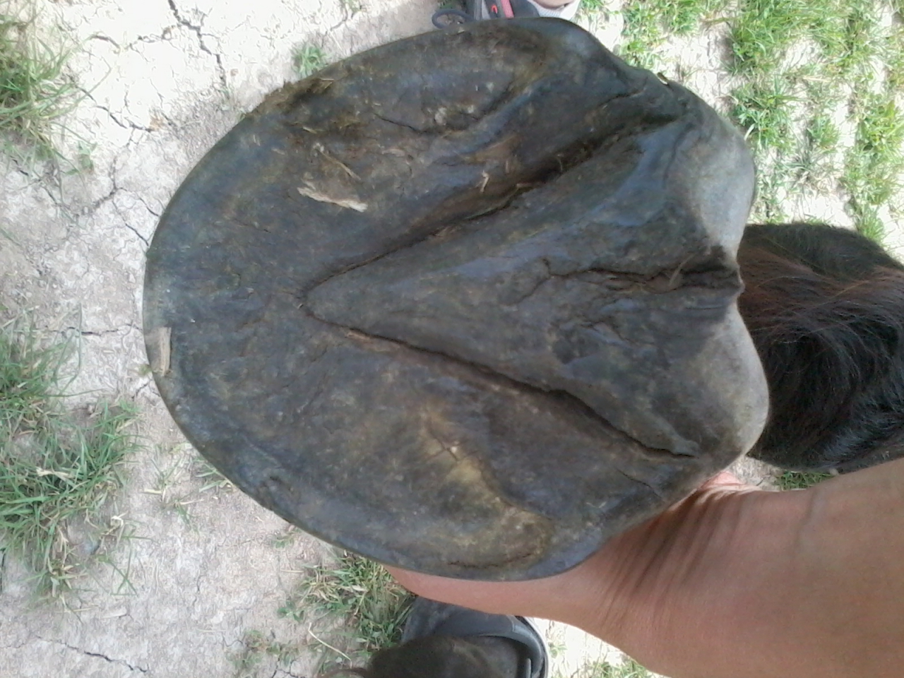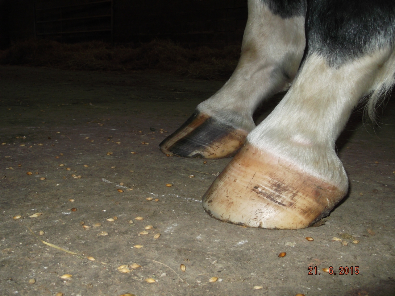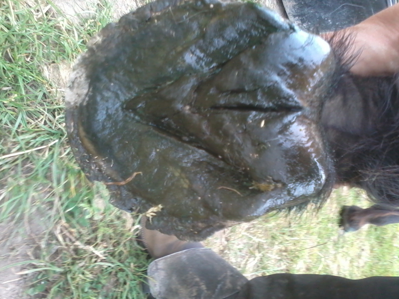 | Dire merci | Salut carococo je voulais avoir des nouvelles de tes pieds de PS. Après bien des misères j'ai fait déferré mon réformé des courses, qui défferrait et cassait de la corne, ça devenait dangereux. Les postérieurs ça va, je les ai déférrés et j'ai pu monter en carrière après 5/6 jours sans problème. Pas de sensibilité. Déferrage des antérieurs : boiterie au pré pendant 8 jours, et depuis ça va au pré mais extrème sensibilité ( je pense que mon cheval est très expressif à la douleur aussi). Il n'avance pas même avec des sandales. Par exemple il n'est pas montable même en carrière,il est trop mal à l'aise. Je viens de lui acheter des semelles pour mettre dans ses sandales.... En gros : combien de temps pour que les pieds s'améliorent ? Est ce que c'est juste la forme du pied qui s'améliore ou aussi la corne ? Mon cheval est au pré, mange de l'herbe et du foin ceci depuis décembre. Je vais le voir en pension 4 fois / semaine. Je nouris le sabot avec de la graisse à chaque fois. Je donne des cures de biotine 2 x par an. Il a la corne fine et friable. Le pied plat (plus que le premier en photo). Je vais faire venir un pareur spécialisé dans le pieds nu, mais je vois bien que c'est pas simple pour un PS. Ca me rassurerait d'avoir un délais aproximatif pour voir si ça suit un cours normal... |