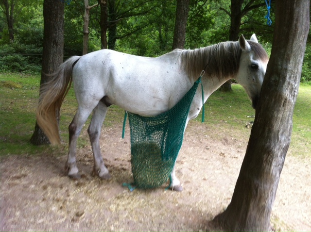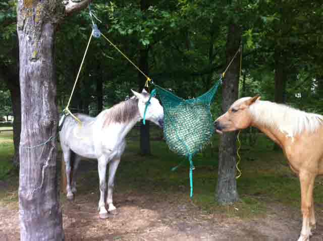 DéconnectéDire merci | Le principe de disperser des petits filets à foin sur un parcours c'est d'inciter les chevaux à bouger, ils passent leur temps à aller d'un filet à l'autre, et il y a toujours suffisamment de filets pour que chacun puisse se nourrir, et plus il y a de chevaux dominants et plus tout le monde bouge. Avec un seul filet, ils campent autour, et cela implique qu'ils s'entendent bien sinon en effet il n'y en a qu'un qui mange. |
